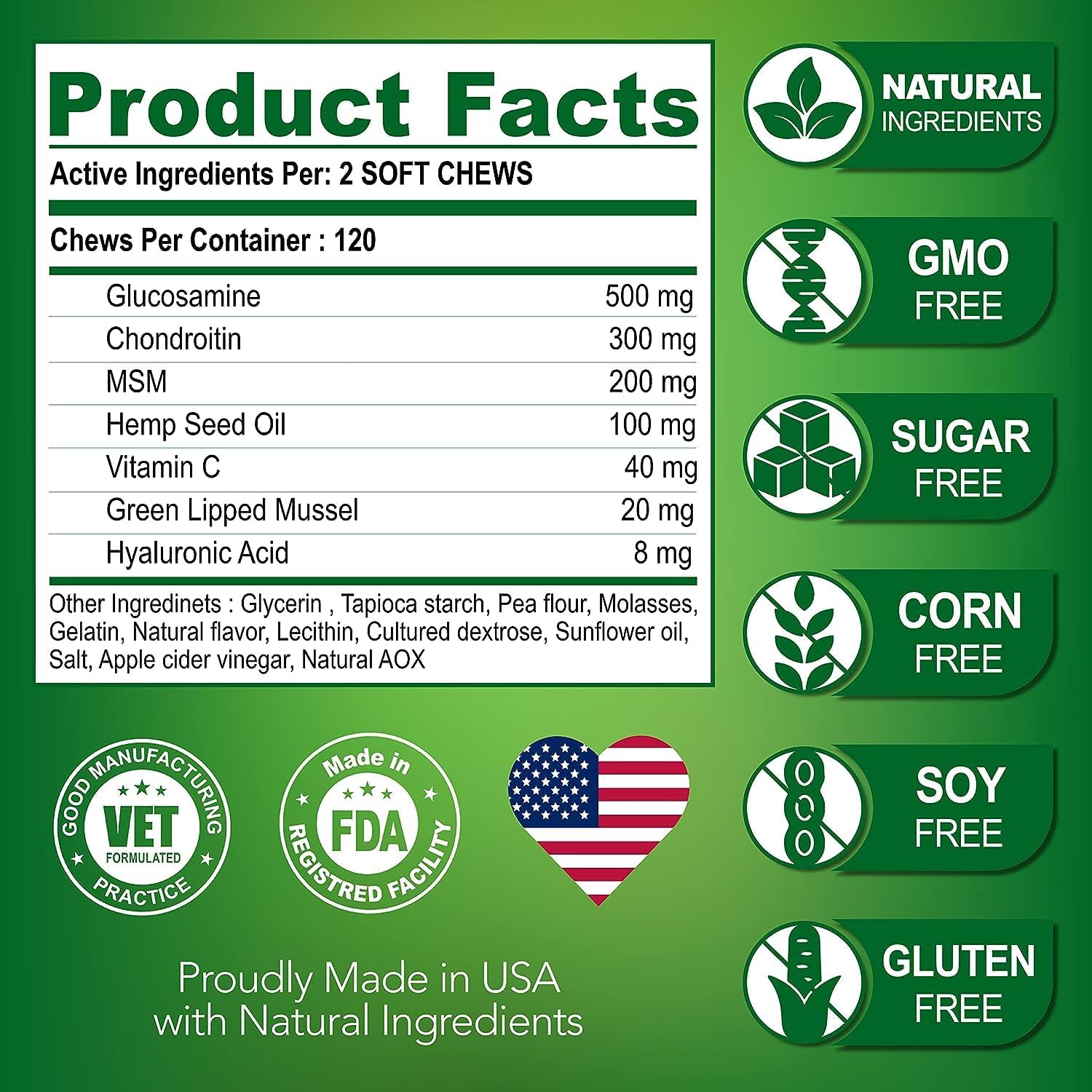 - Premium Natural Ingredients Give Results: No Added Sugar, Wheat, Corn, Gmo or Preservatives. We are committed to using only best ingredients that deliver results in our dog glucosamine chews