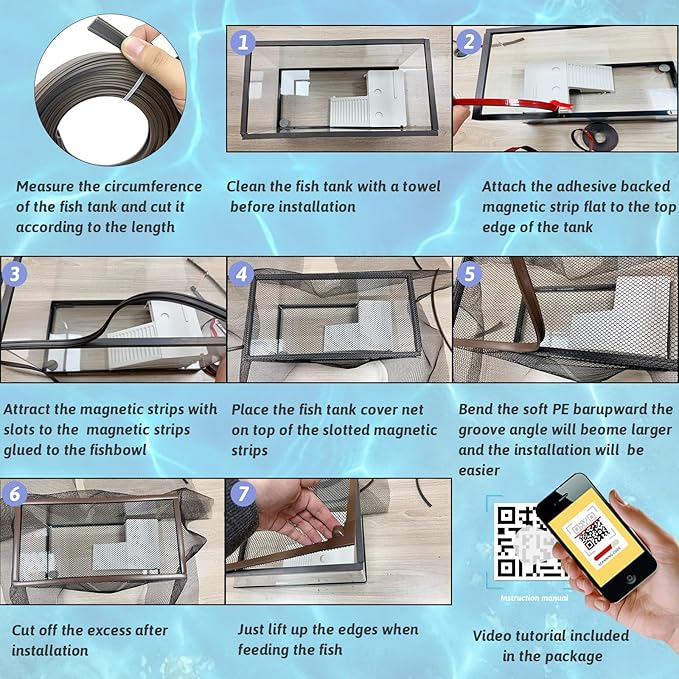 - PRODUCTS YOU'LL RECEIVE: The extra-long size of this magnetic mesh covers set is sufficient for your use. 13.8 ft. long PVC Strip (brown), 13.8 ft. long Grooved magnetic Strip (brown), 13.8 ft. long Adhesive-backed magnetic Strip, 4 fish tank corner buckle, 4 fixing buckle and 5 ft. long X 6.5 ft. wide aquarium cover net. Enough length for you to cut for multiple aquariums!