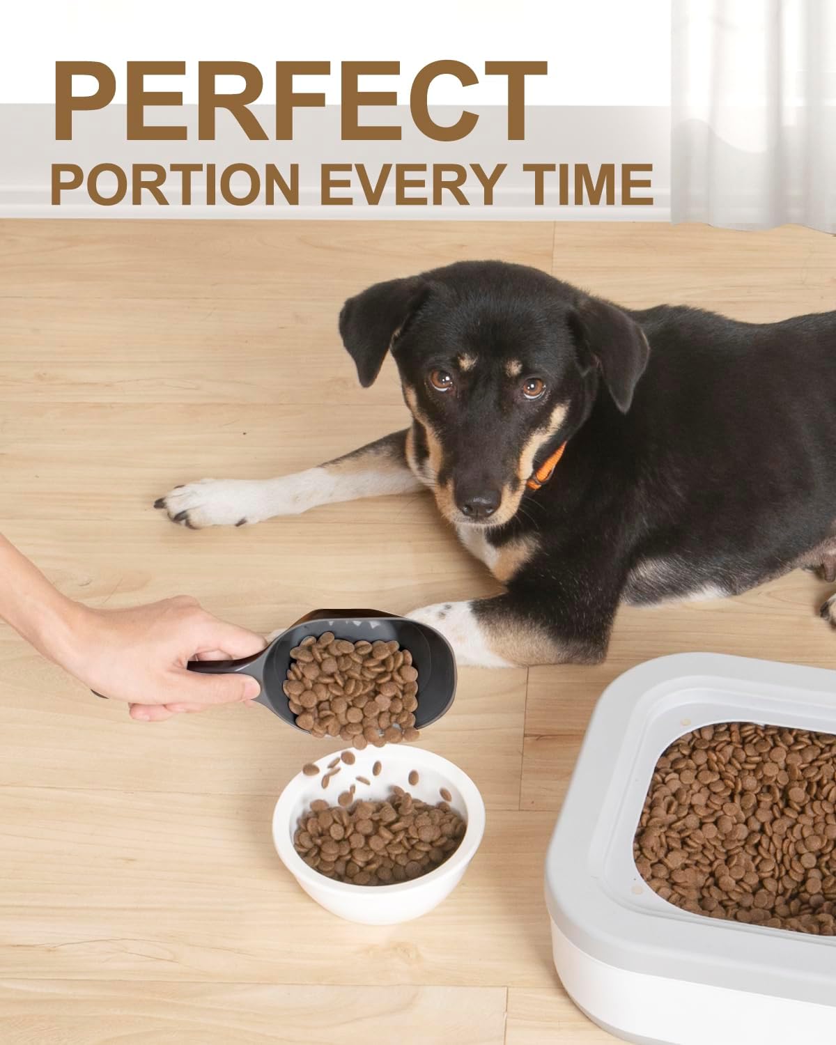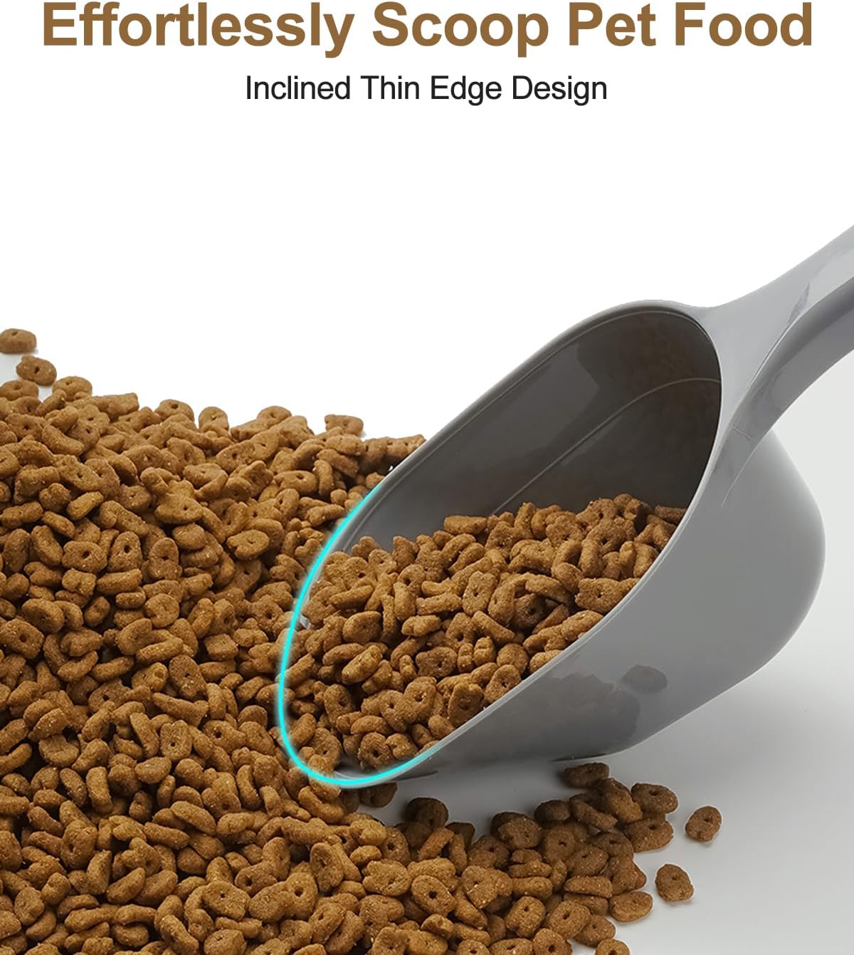 - Easy to use:The Dog Food Scoop comes with an ergonomic long handle that makes it easier to put food in and not have to bend over. The special angle of the lip of the cup makes scooping up the food very easy