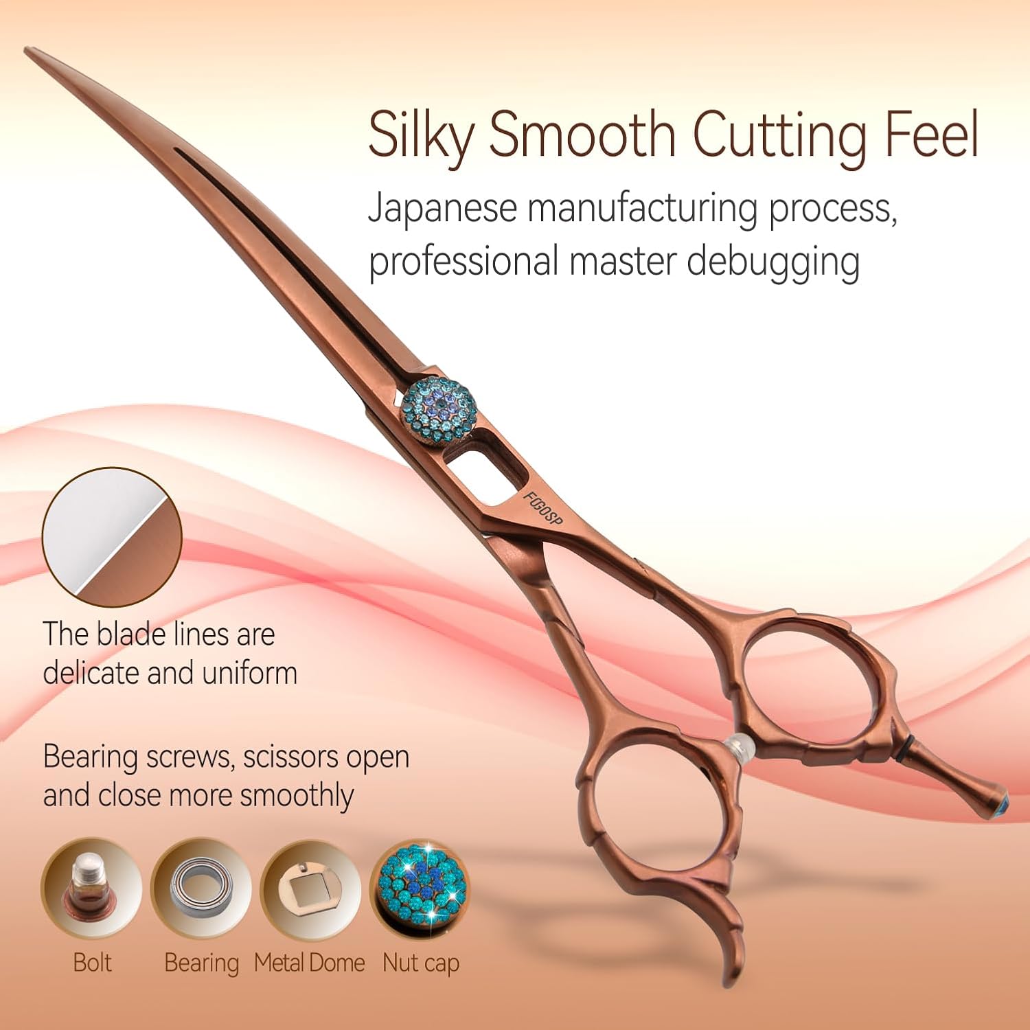 - ๐[Fashion Design and Matching] The dog grooming scissors adopt vacuum electroplating titanium alloy technology, chocolate color, primitive simplicity, elegant, and stable. High precision CNC screws with blue artificial diamonds embedded on the surface, like the eyes of God, dynamic and energetic. Every time you open and close the FOGOSP dog scissors, it feels silky smooth like enjoying chocolate.
