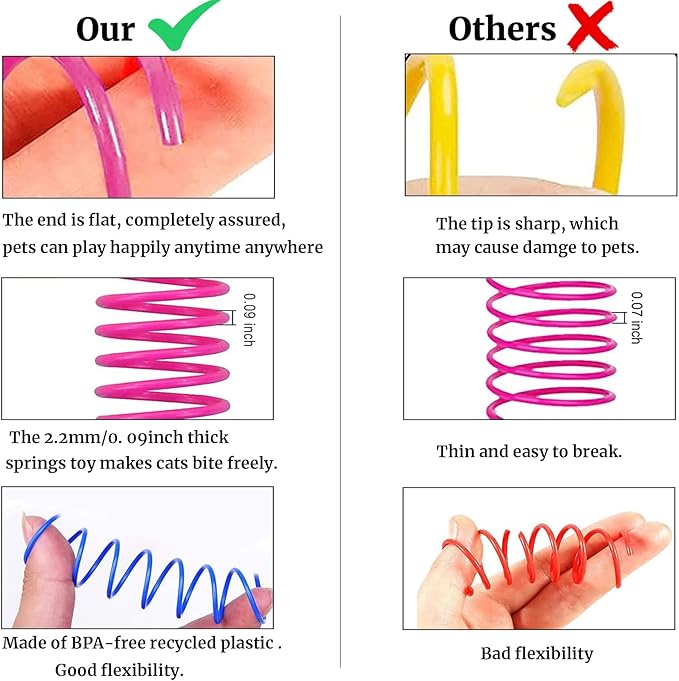 - Non-Toxic Materials -- These Colorful Cat Spring Toys are made of high-quality plastic Which is safer for cats and kittens. It’s lightweight, durable. The thick 2.2mm spring toys make cats bite freely.