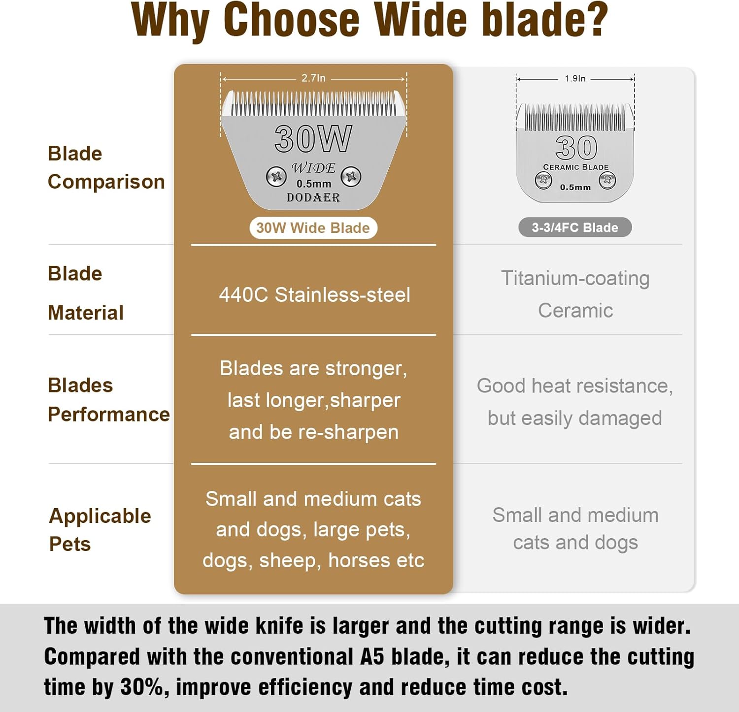 - ▶【SIZE】:30W blade (Cutting length 1/50” 0.5mm) ,wide blade has a large area and is suitable for trimming large pets,Compared to A5 blades, it can improve work efficiency.〈Note〉 our wide blade is not compatible with the conventional A5 guard comb on the market