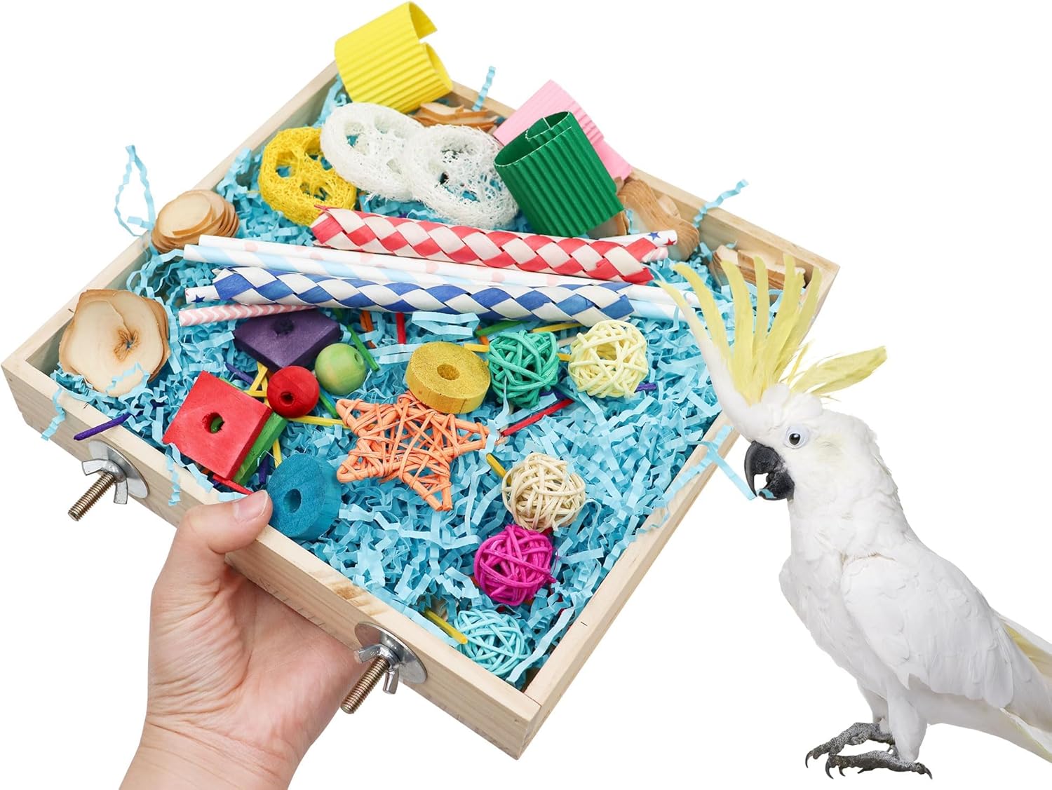 - Dual-Purpose Foraging Design: Transform the toy box into a foraging experience by adding your bird's favorite treats. This interactive element engages birds in a delightful search for hidden treasures, combining play and treat time.