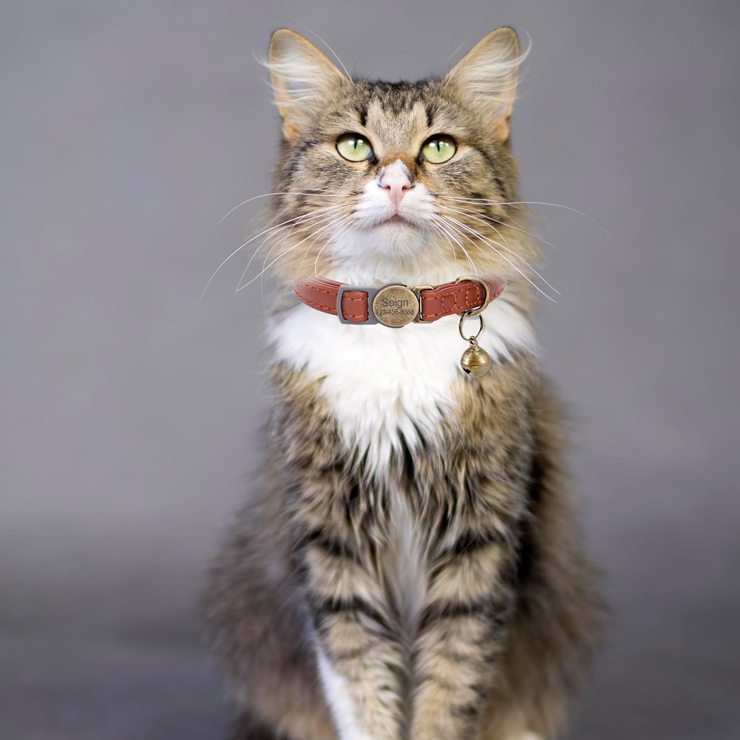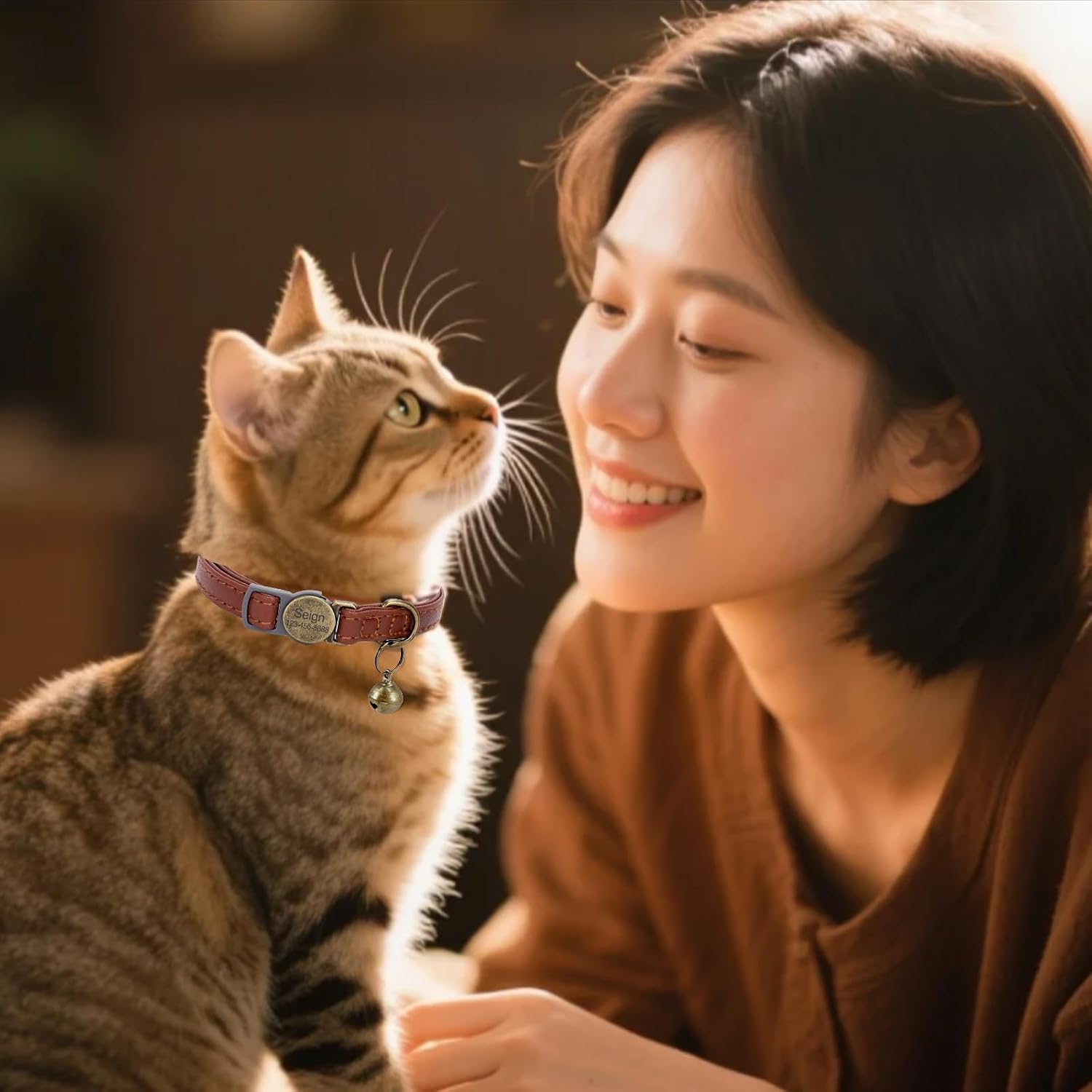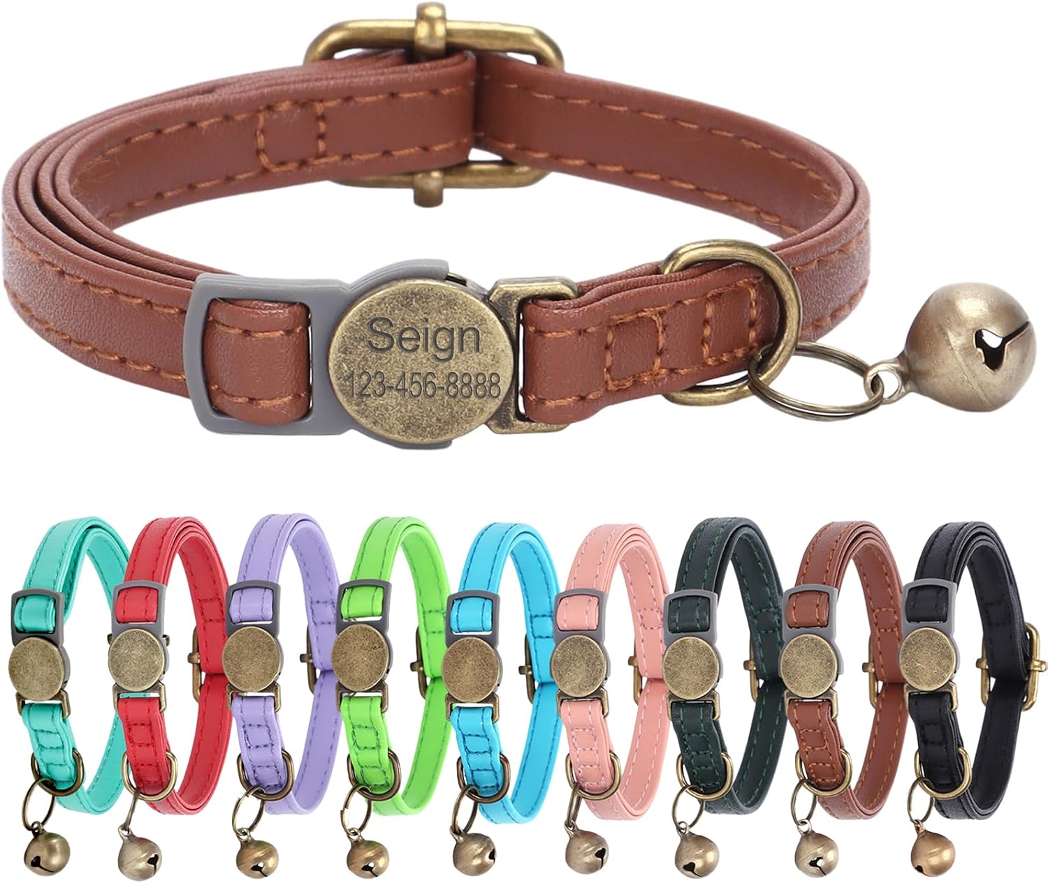 Cat Collar Breakaway, Personalized Leather Cat Collar with Bells-Adjustable Customized Collar with Name & Phone Number Tag for Girl Boy Cats -Quick Release Buckle for Cats & Kittens(Brown)