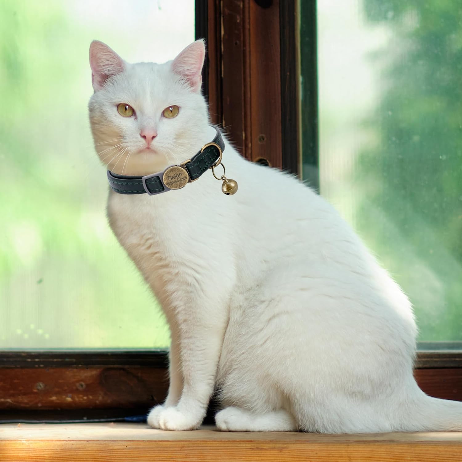 Cat Collar Breakaway, Personalized Leather Cat Collar with Bells-Adjustable Customized Collar with Name & Phone Number Tag for Girl Boy Cats -Quick Release Buckle for Cats & Kittens(Green)