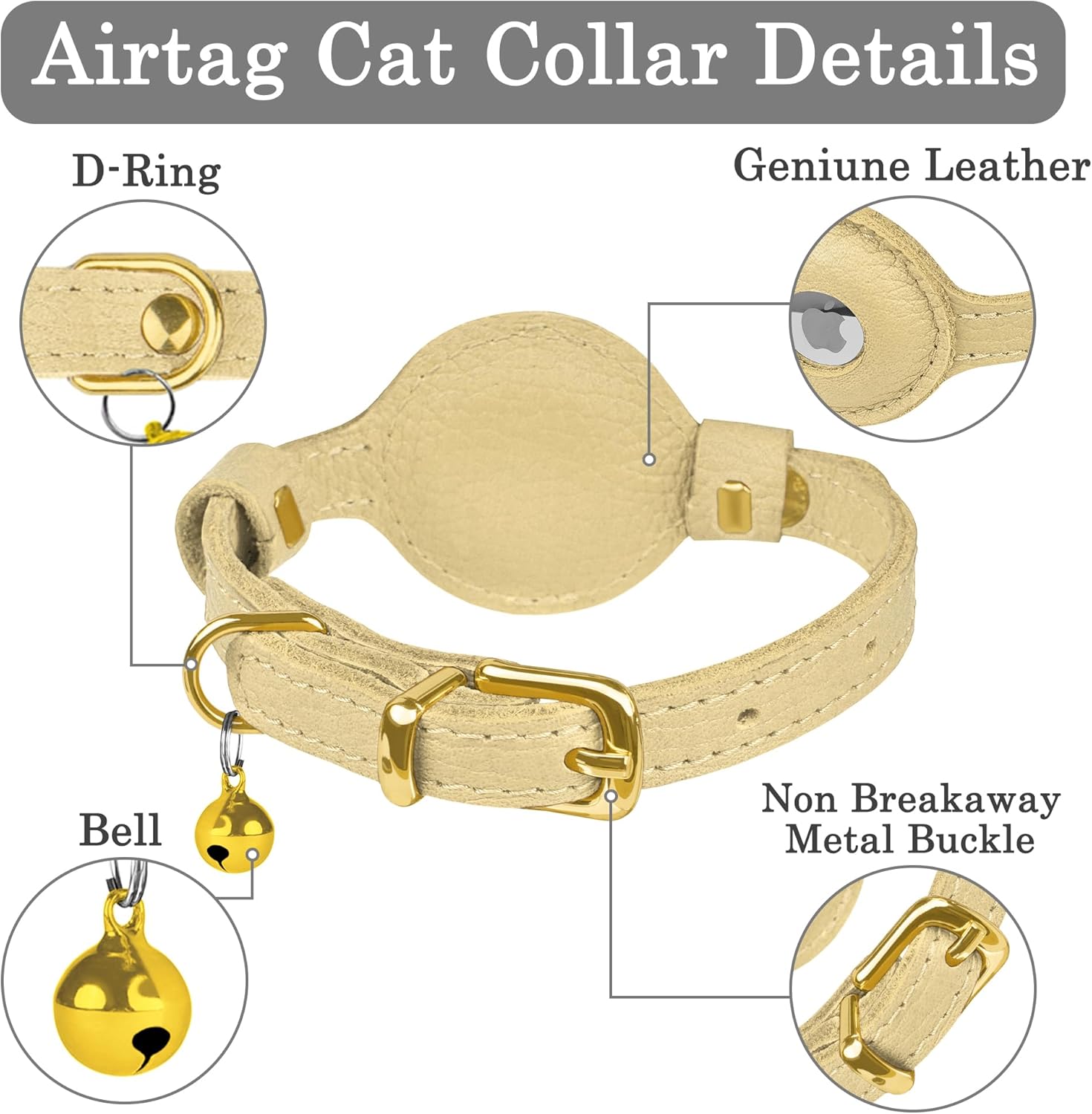 OOPSDOGGY Leather AirTag Cat Collar with Bell - Non Breakaway Kitten Collar with Apple Air Tag Holder - Lightweight GPS Pet Collars for Girl Boy Cats, Small Dogs, Puppies (Beige)