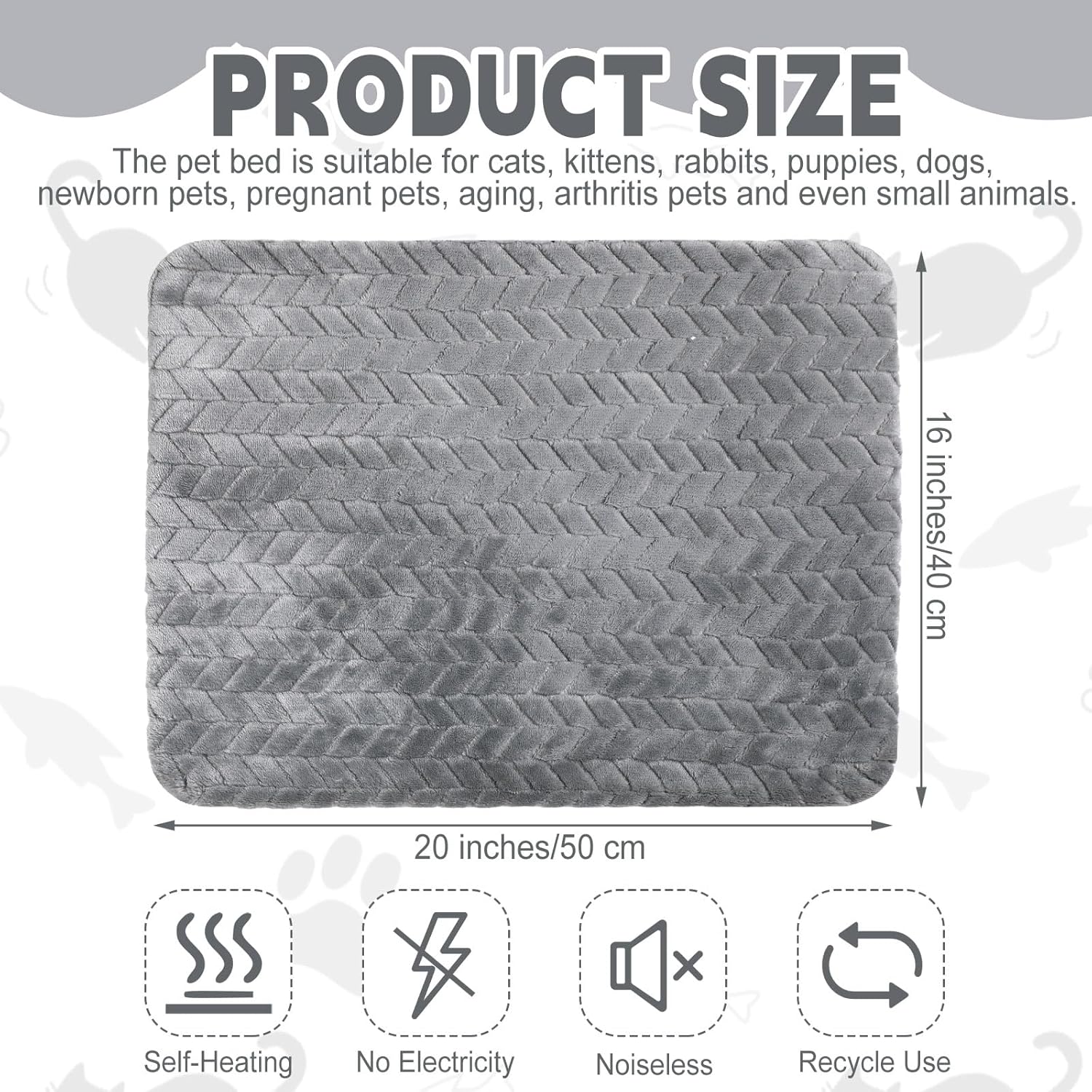 - Proper Size: the package includes 4 packs of self warming cat beds, each size is about 16 x 20 inches/ 40 x 50 cm, ideal for cats, kittens, dogs, puppies, newborn pets, pregnant pets, aging and arthritic pets; Also works well for small animals, such as guinea pigs, rabbits, can be applied on floors, sofas, pet beds, cat perches, pet carriers and outdoor cat houses; The cat warming pads are also ideal gifts for your friends who have pet