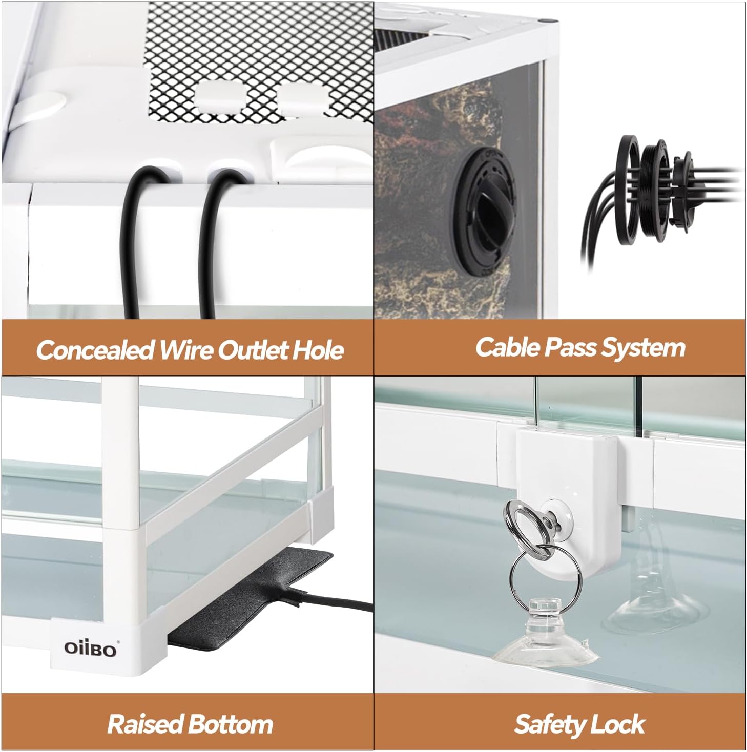 - 【Practical design】Raised bottom frame in order to fit heating pad; Waterproof bottom makes this tank can be used both as desert terrarium and rainforest tank; Great wire management, cable pass on the side can max hold 4 lines, on top also have tube inlets.