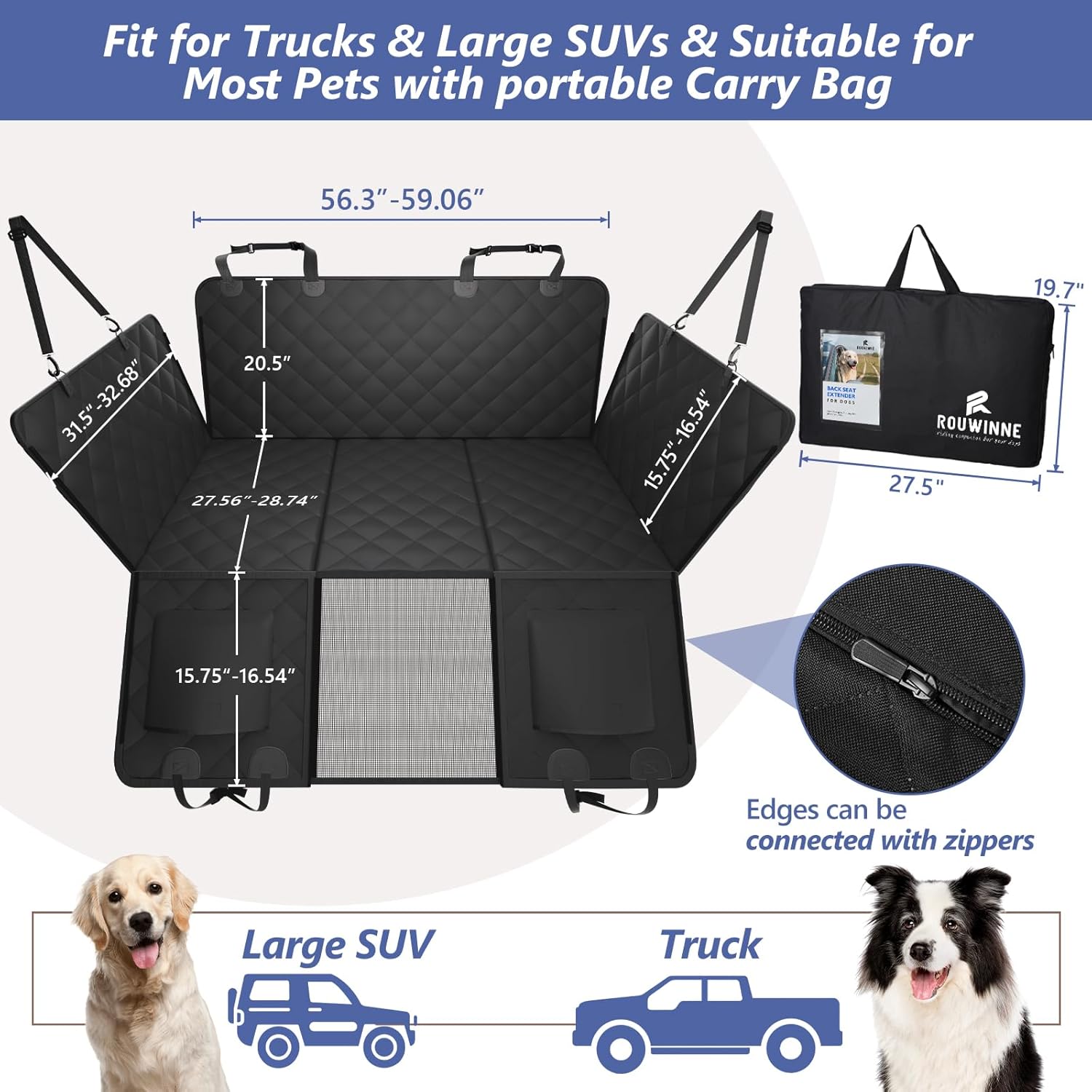 - 【MESH WINDOW, THICKENDE WEBBING & STORAGE POCKETS】 ROUWINNE back seat pet cover for dogs opens a mesh window for more breathable, allows your dogs see you and reduce anxiety. The mesh window is also equipped with non-slip zippers on both sides, through which you can also interact with your dogs. The encrypted and wider webbing latch is more sturdy. This truck rear seat covers for dogs has two large storage pockets to put your dog's toys and snacks in. Take your dogs on a safe and comfort trip!