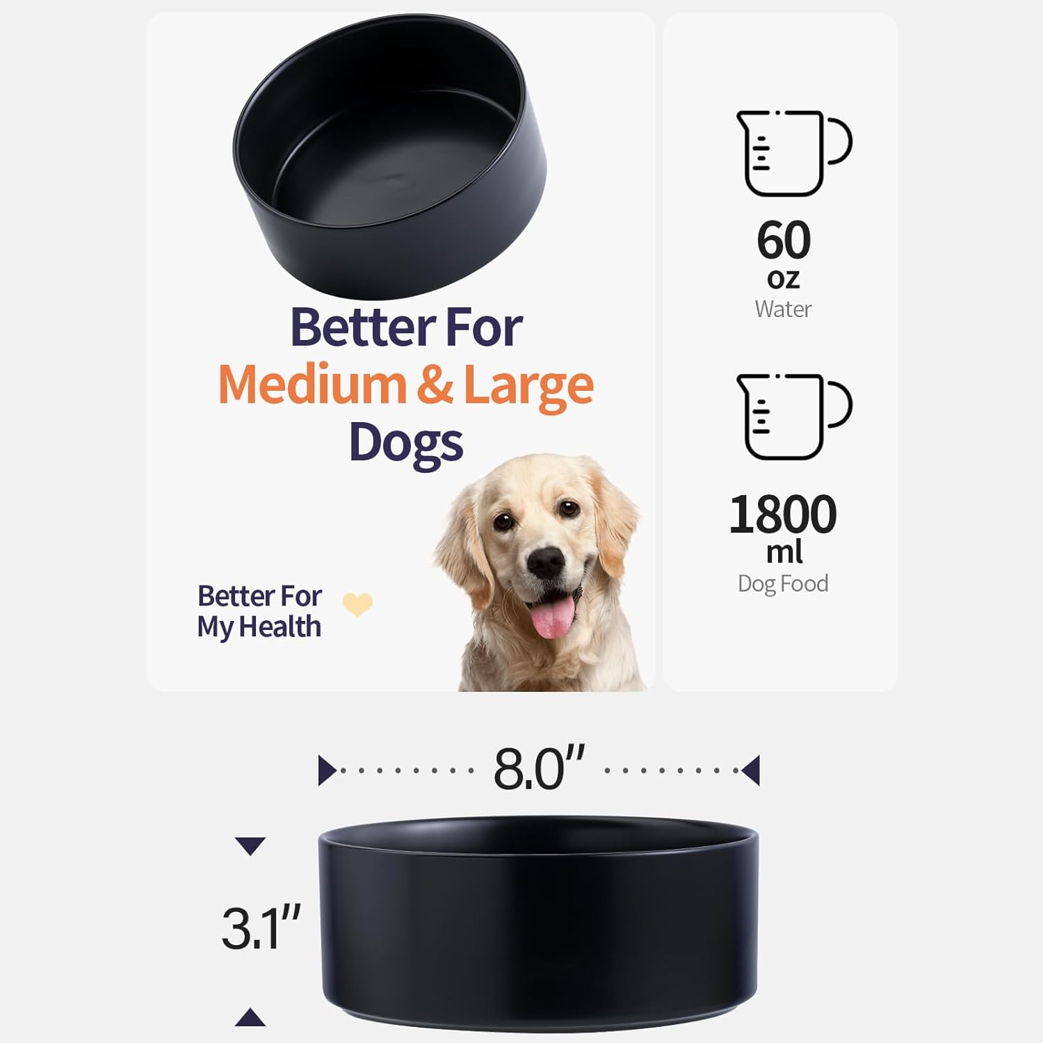 - EXTRA LARGE CAPACITY: This ceramic dog bowl measures 8 "W * 3. "H" and can hold up to 60oz ≈ 1800ml of dog food or water, perfect for different breeds of medium and large dogs. this elevated bowl can be used as an extra large food and water bowl.This large Pet Bowl not only suitable for dry food and water,but also perfectly match wet food and other pet snacks.