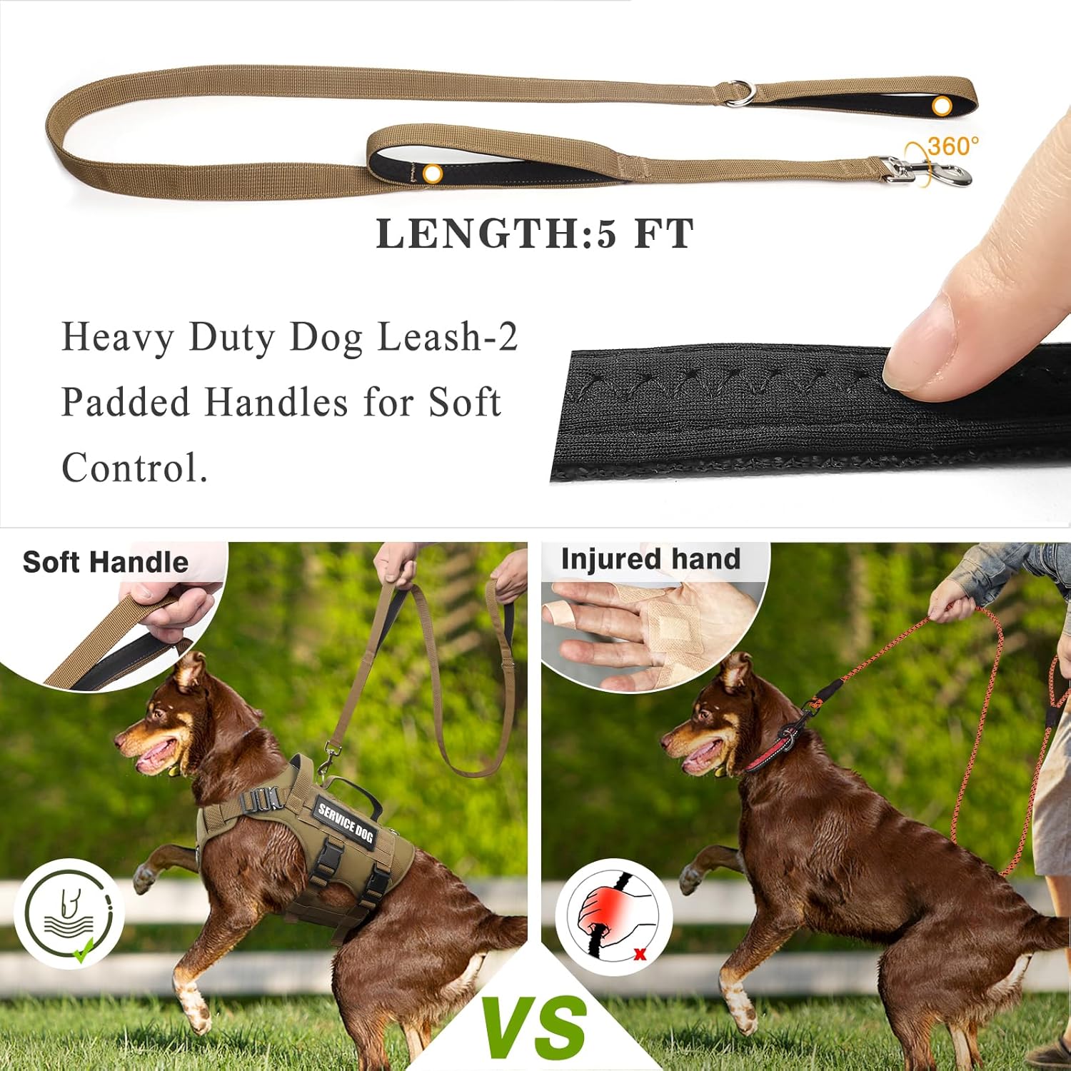 - 【Padded Sturdy Handle for Harness and Leash】: The double handles for harness are great for you to assist your dog in any position, it is much safer than pulling at a collar that is around the neck. A full tactical dog harness leash set including: 1 military dog vest harness + 2 backpack pouches + 1 training dog leash with 2 padded handles + 10 patches reflective.