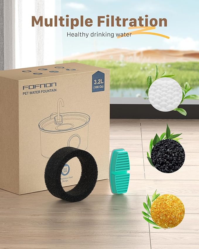 - 【Advantage: Multiple Filtration】 Stainless steel cat water fountain uses multiple filtration systems. The carbon filter is made of various materials to effectively filter out dust, fine debris and soften the water. The pump filter attracts floating hairs in the stainless steel cat water fountain. Purifying water quality, pets can drink water without worry.
