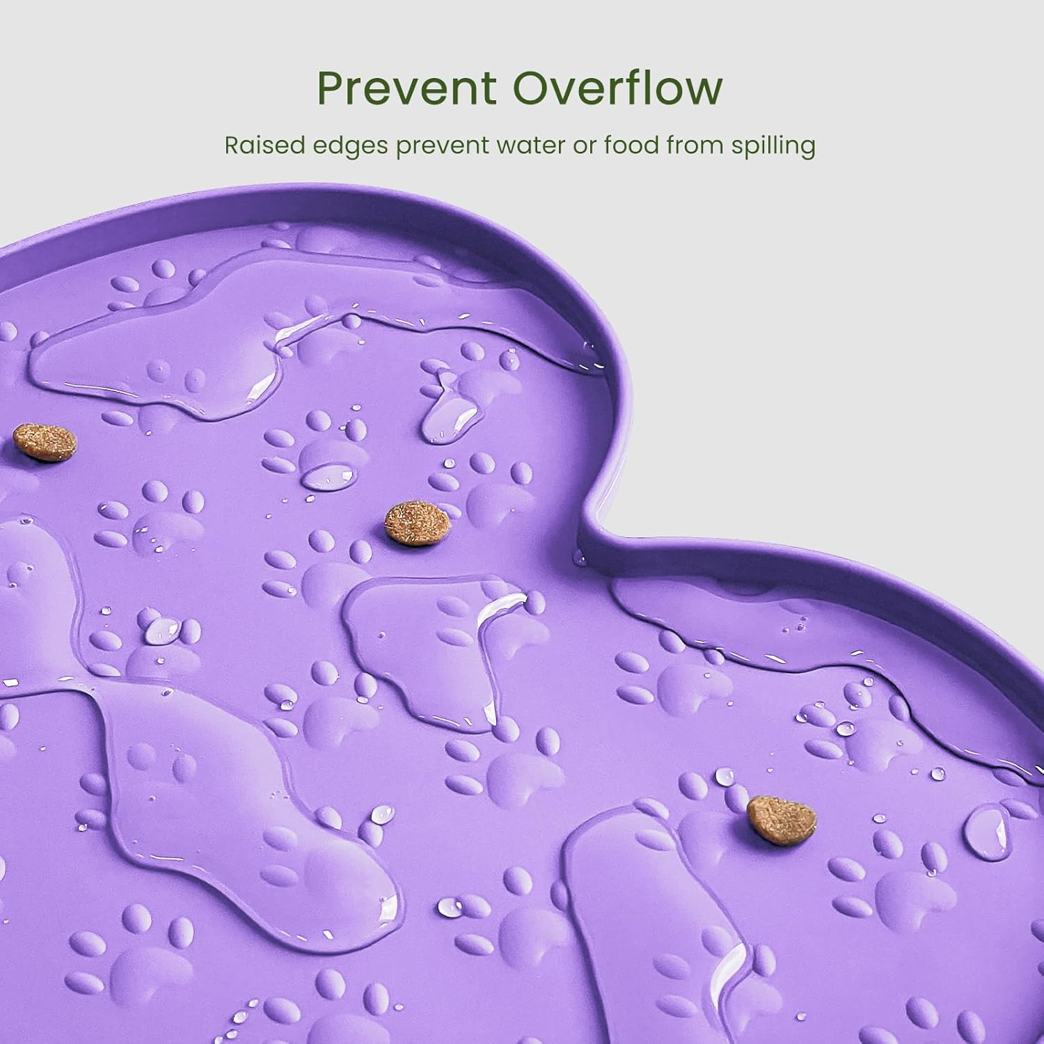 - Raised Edge - The high edge of this feeder mat keeps food and water within the tray and prevents spillage onto a clean floor. Keep your living space tidy and clean, say goodbye to messy floors, you just need to clean the dog bowl mat regularly.