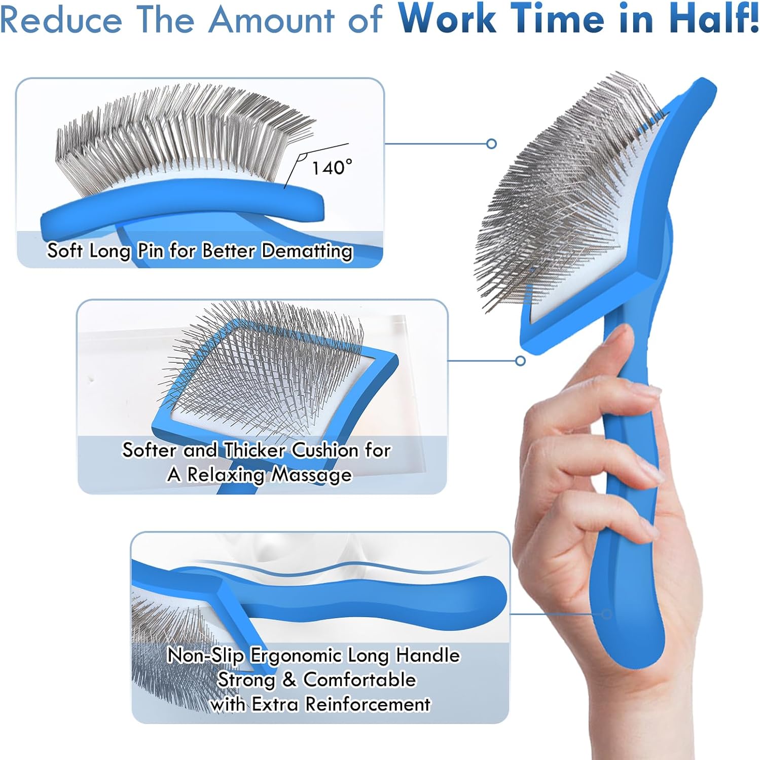 - [Professional Pet Grooming Kit] Effective brush with long, denser, and softer pins, 2-IN-1 detangling handle comb designed with long and short metal teeth groom top coat and undercoat at one time. Wide and narrow teeth comb for loose hair, dander & dirt trapped beneath fur.