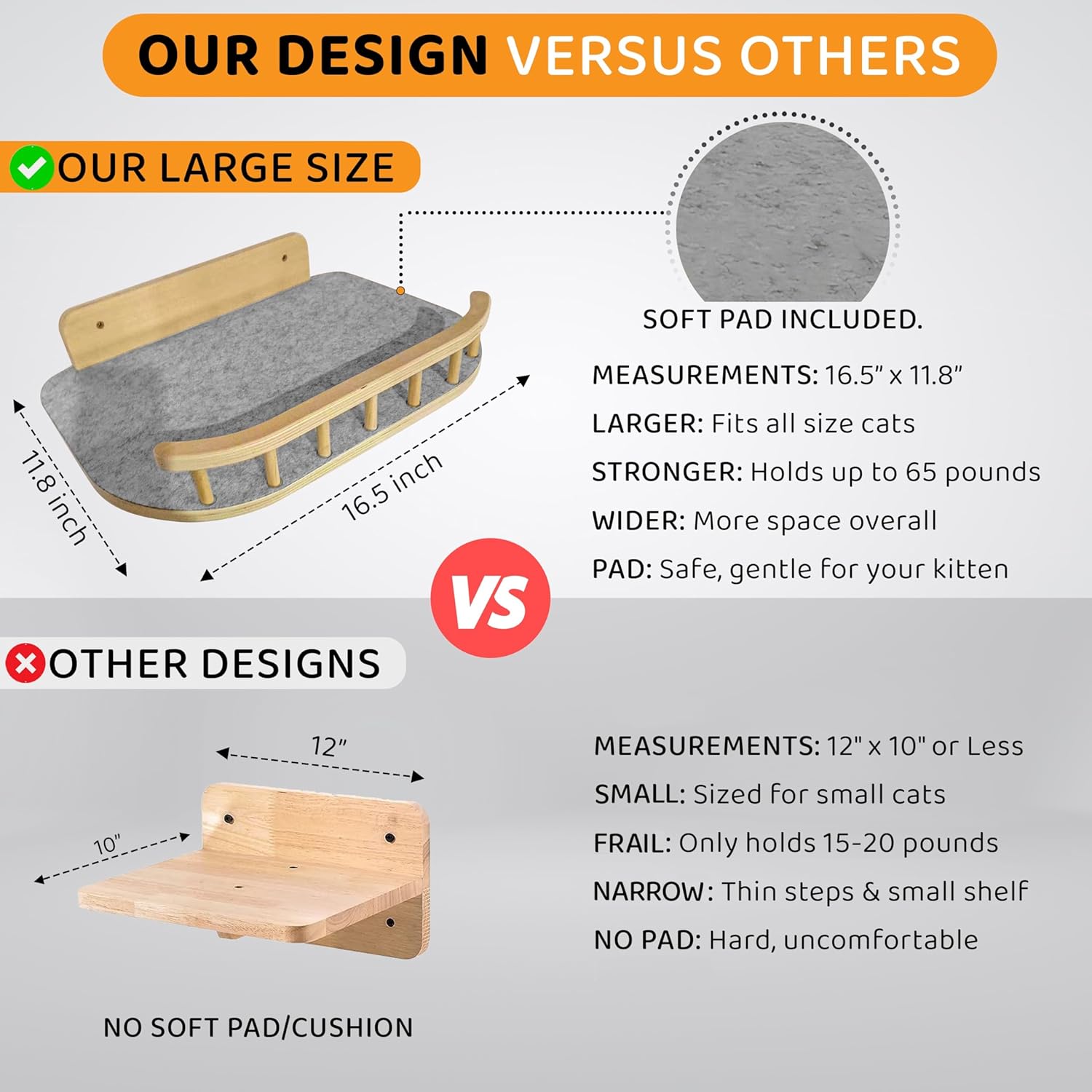 - PREMIUM HARDWOOD & HEAVY DUTY SUPPORT – This wall-mounted set includes 3 steps and 1 cat bed, crafted from top-quality wood and built to support up to 65 lbs, ideal for large cats. The smooth finish and plush elements provide comfort while encouraging active play and exploration.