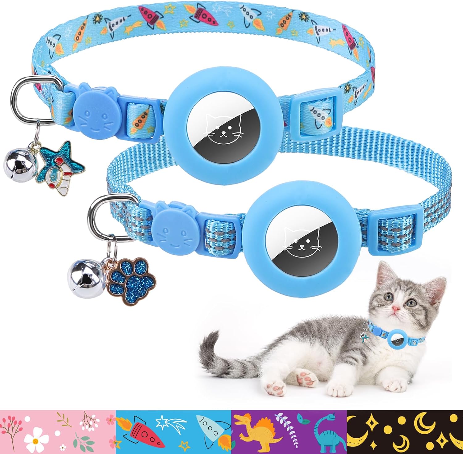 PUPTECK Airtag Cat Collar Breakaway 2 Pack with Bells, Reflective Kitten Collar with Air Tag Holder for Boy Girl Kitty and Puppies, Soft, Blue
