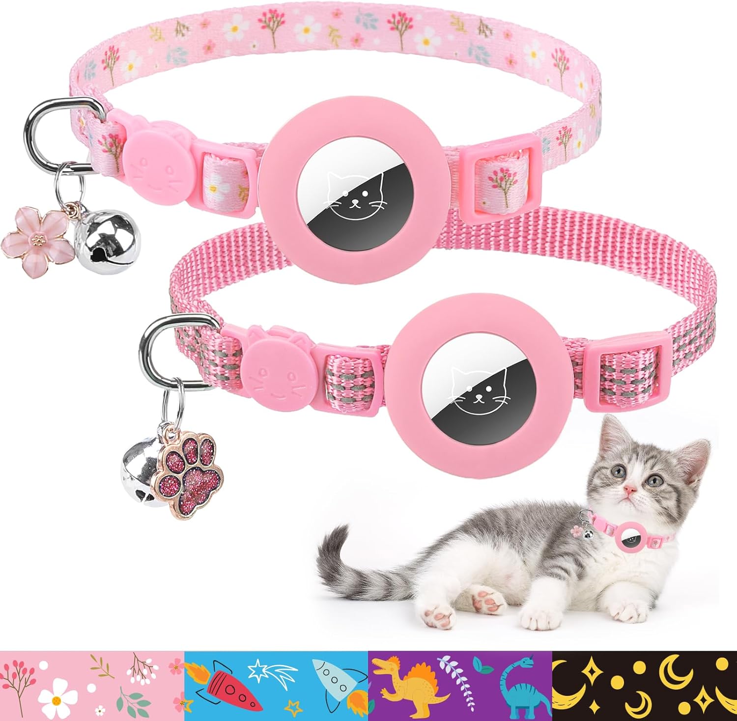 PUPTECK Airtag Cat Collar Breakaway 2 Pack with Bells, Reflective Kitten Collar with Air Tag Holder for Boy Girl Kitty and Puppies, Soft, Pink