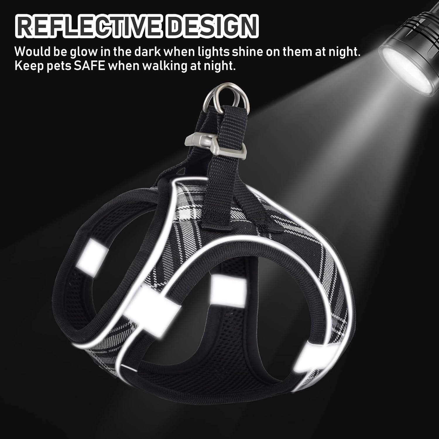 - REFLECTIVE: This Harness has reflective lines around and four large reflective points. Reflective strips deign reflect ambient light in low light conditions, making you and your dog safer when walking and moving around at night without worrying about blurred vision in the dark. ANTI-LOST ID TAG: You can write name, address, phone number or contact information, after put to ID tag. Anyone that finds your pet can contact you to return your pet by the information you wrote down.
