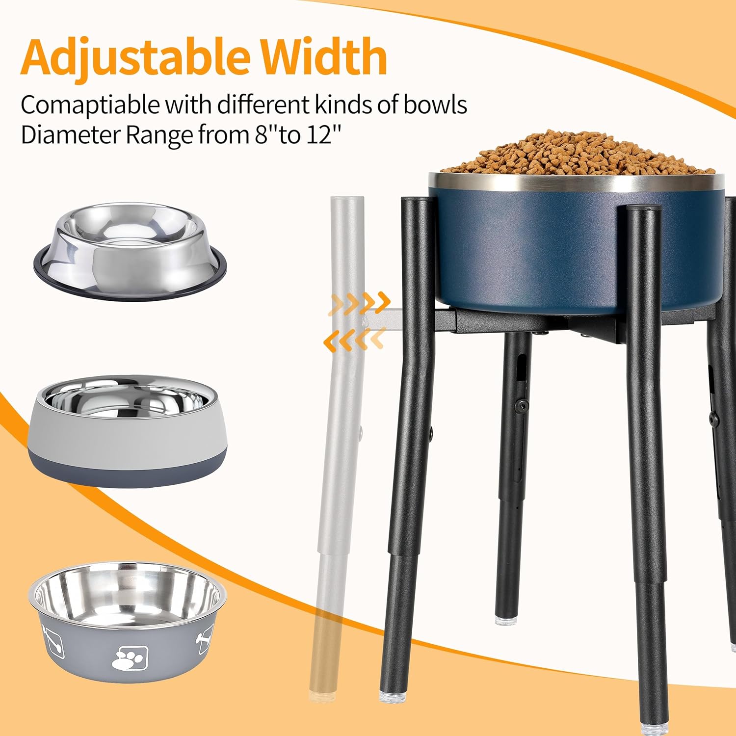 - Width Adjustable Design: The PROERR dog bowl stand is designed to accommodate kinds of dog bowls, with a width adjustable feature that allows you to fit size rang frome 8"-12" of food and water bowls for your pet.
