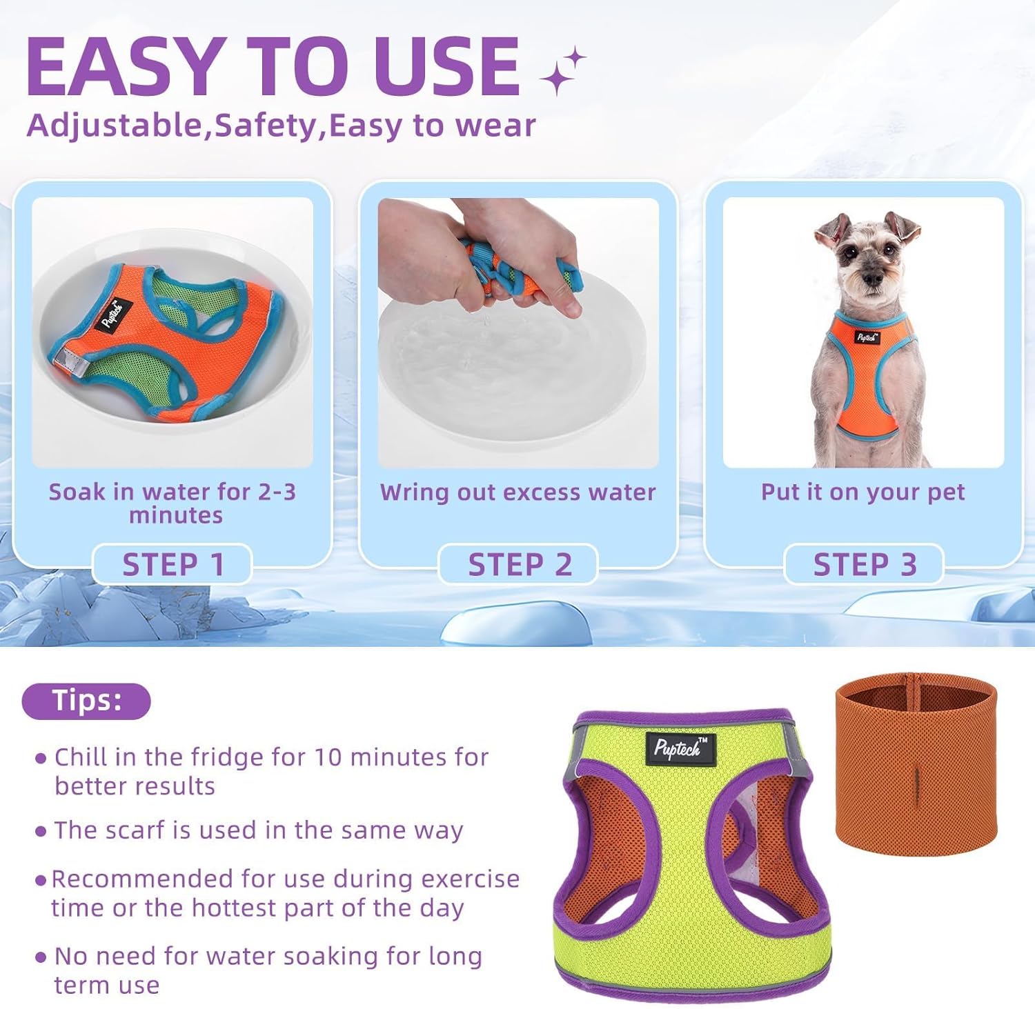 - [DOG HARNESS, COLLAR & LEASH] - The package includes three items, a walking harness, a scarf collar, and a 4.9ft matching leash. The scarf collar is made of cooling, breathable and heat-dissipating fabric, the leash is equipped with a 360-degree rotation metal hook, and the harness is adopted with a quick-release buckle and double D-rings which are very heavy-duty. You don't need to spend extra time looking through other accessories, this is a very cost-effective set.