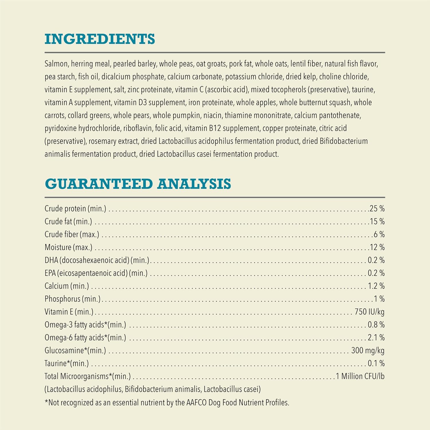 - Thoughtfully balanced recipes with protein-rich salmon, wholesome grains, vegetables and fruit. Packed with nutrients, not fillers, for less than $1.40/day*.