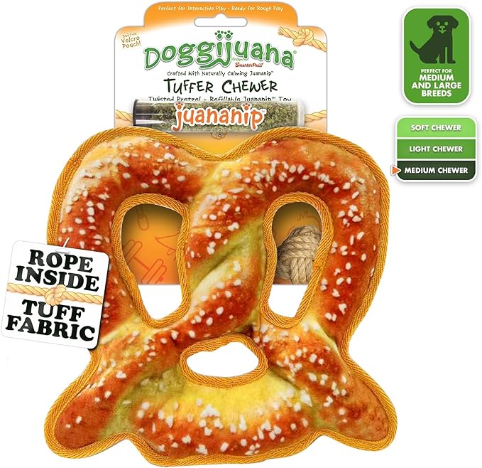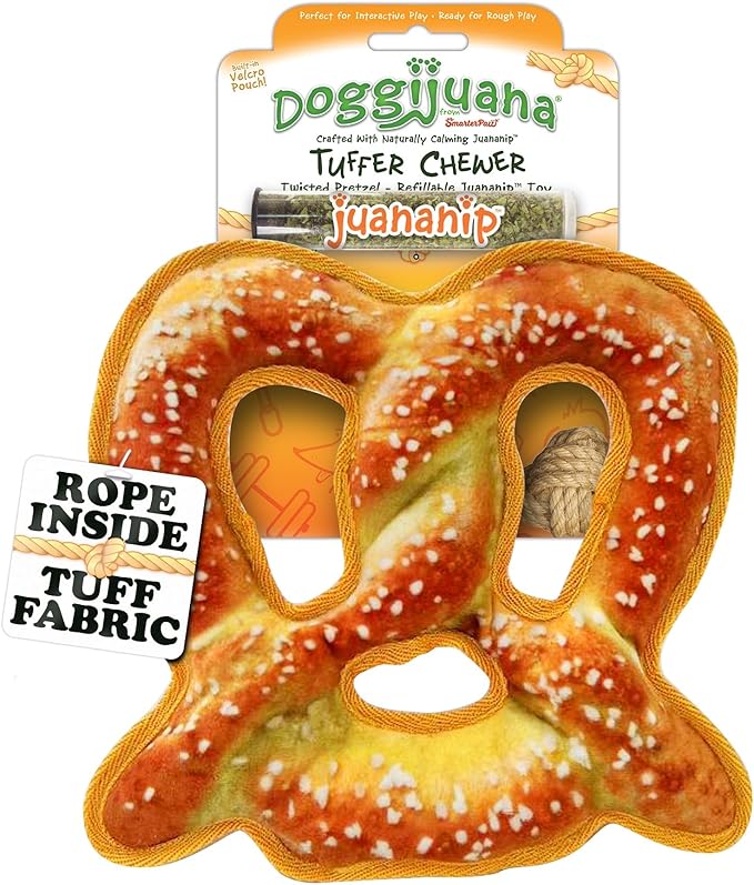 Doggijuana Tuffer Chewer Plush Dog Toy | Funny Dog Toy Plush with Juananip Catnip for Dogs | Calming Aid for Dogs | Interactive Squeaky Chew Toy for Play (Pretzel)