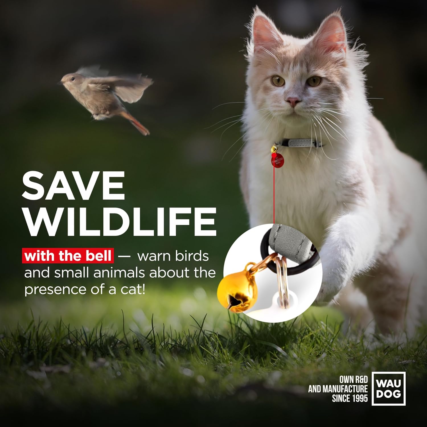 Leather Cat Collar with Bell and Safety Elastic Strap Breakaway Alternative for Small & Large Kittens, Stylish Pet Leather Collar for Boy, Girl Cats with Metal Buckle & QR ID Tag (Gray)