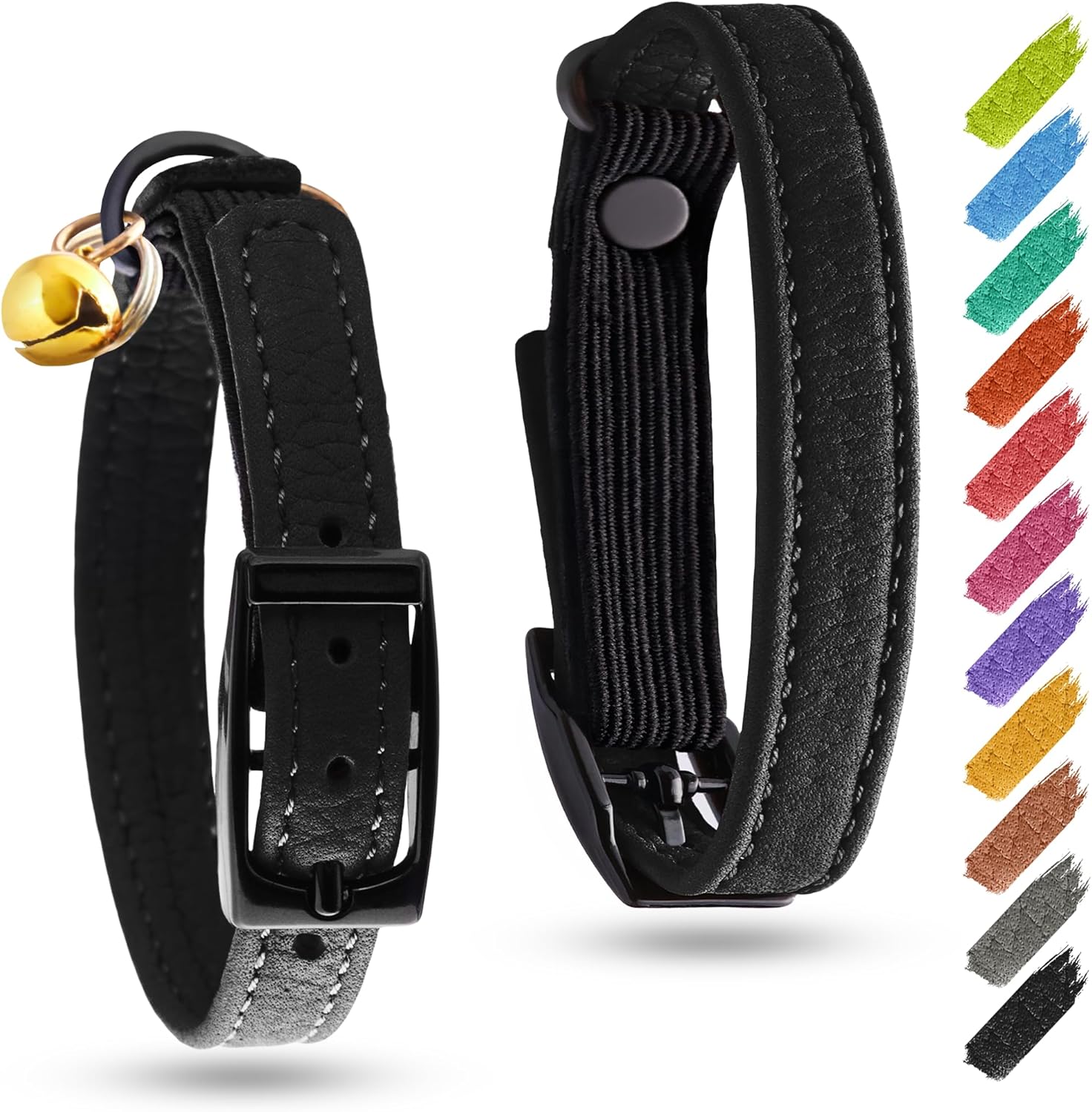 Leather Cat Collar with Bell and Safety Elastic Strap Breakaway Alternative for Small & Large Kittens, Stylish Pet Leather Collar for Boy, Girl Cats with Metal Buckle & QR ID Tag (Black)
