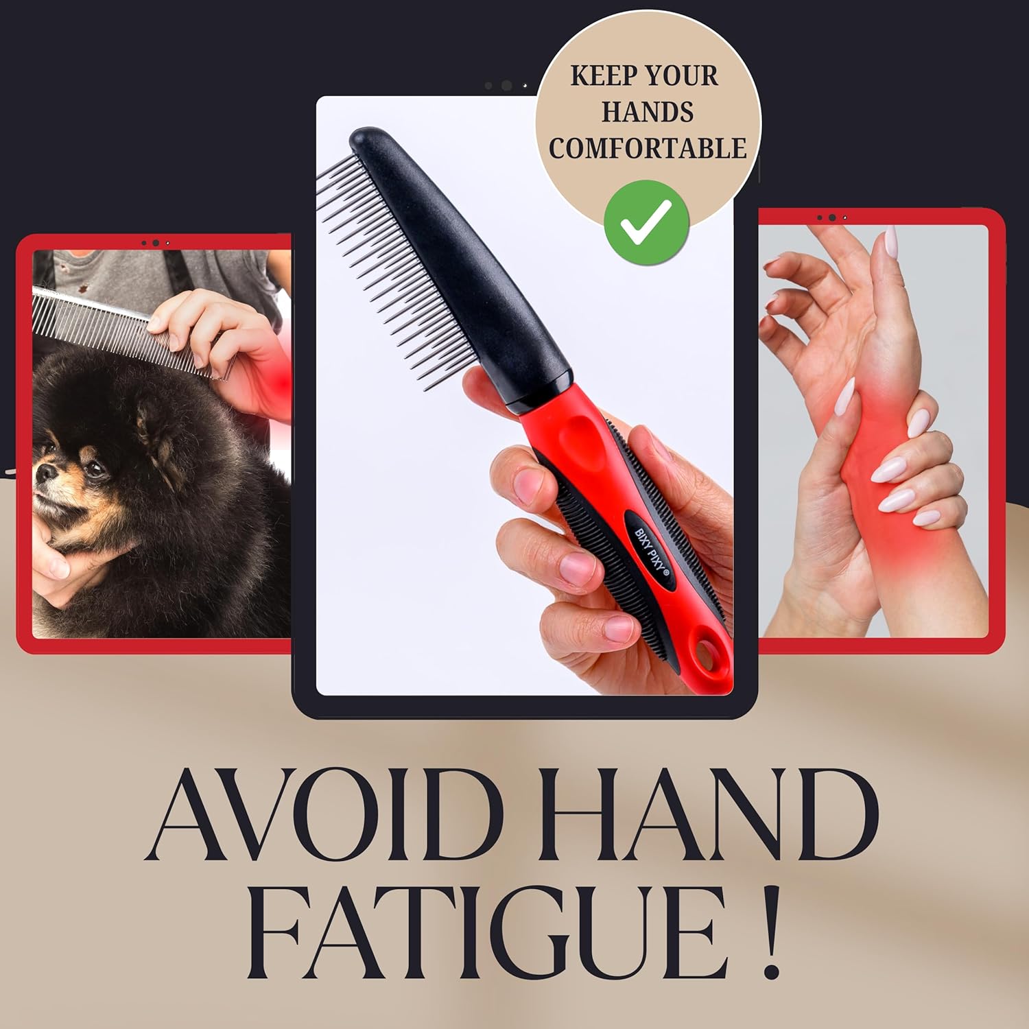 - COMFORTABLE GRIP HANDLE – Designed with love and care. Lightweight handle ensures a comfortable grip and reduces hand fatigue when using for matted hair. Handle features a soft, rubberized, Non-slip texture for a secure and comfortable hold, even when hands are wet. This poodle comb features a long handle and allows to groom hard-to-reach areas on your pet's body and easy maneuverability. Spend less time struggling with knots and more time with your pet