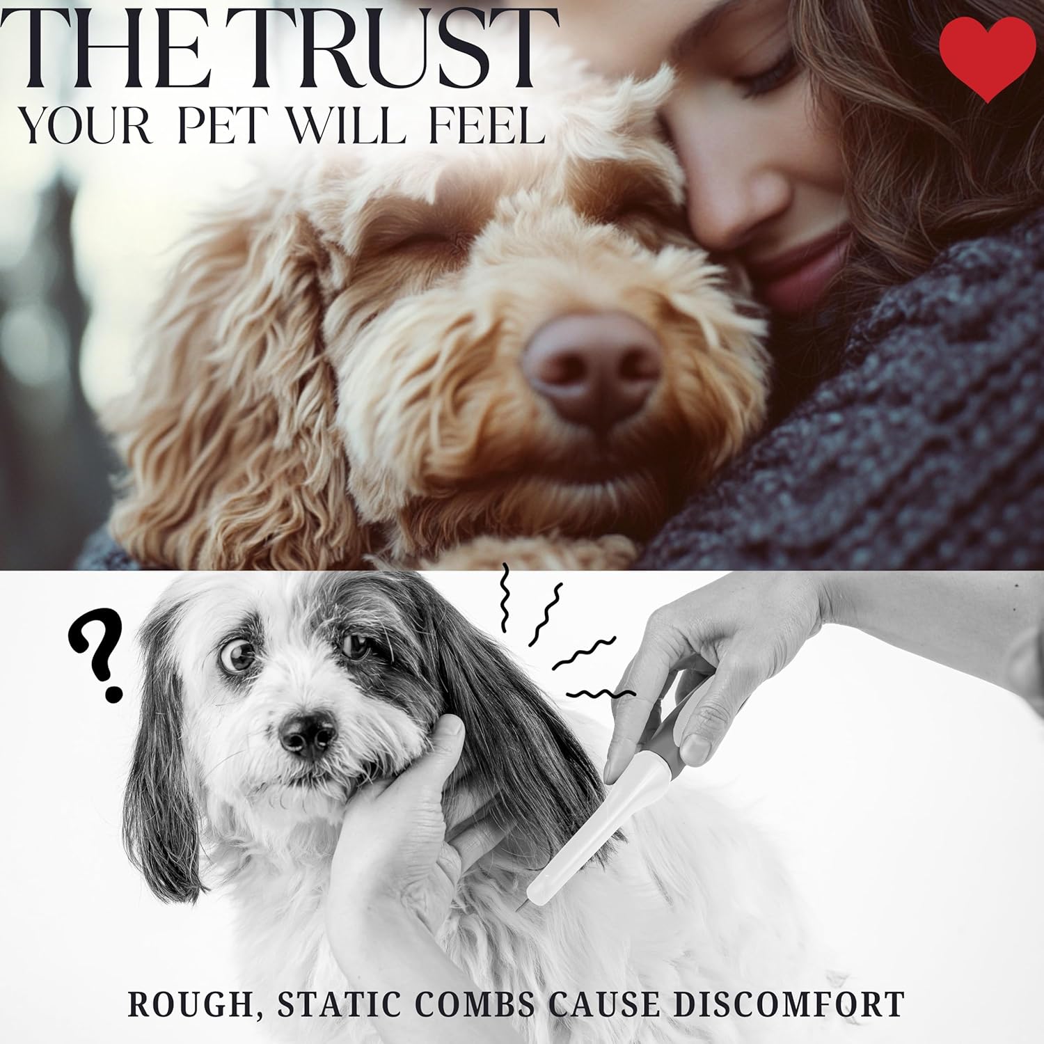 - QUICK DETANGLER – Pet comb with rotating pins gently glide through the pet's fur with a satisfying sweep minimizing pulling and discomfort. Dog grooming comb helps to untangle matted fur with ease, thanks to the flexible movement of the rotating teeth. Simply enjoy a relaxed grooming experience with your pet.