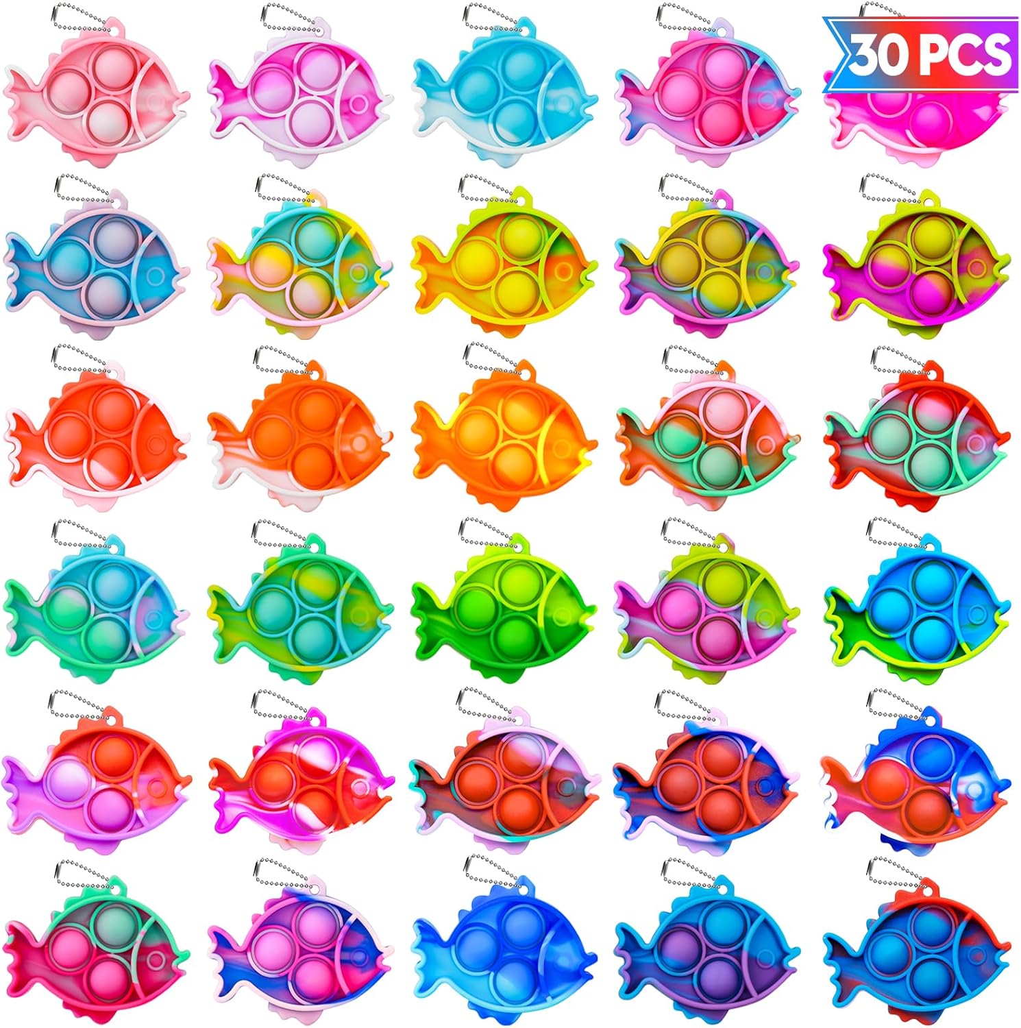 - Party Favors for Kids Carnival Prizes: This cute fish pop keychains for backpacks has bright colors, you will receive box of 30 pop keychain bulk toys for 3 year old boys, sensory fidgets toy pack fidgets for kids. It is also perfect as sensory toys for toddlers 3-4, kids fidget toy, desk toys, autism sensory toys, ADHD fidget toys, fidget toys for kids party gifts, sensory toys for kids 5-7, fidgets for teens, fidgets for girls 10-12, valentines day party favors valentines day gifts for kids.