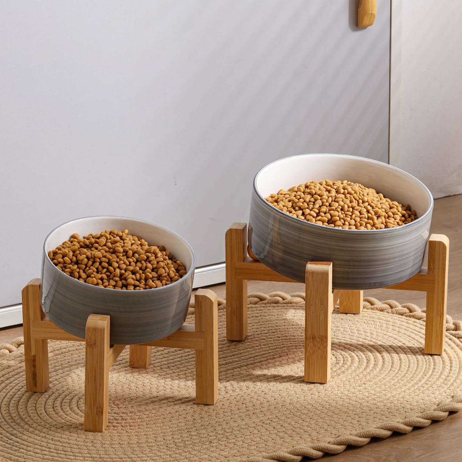 - PERFECT for Medium & Large DOGs - these ceramic pet dishes are perfect for medium and Large sized dog bowls which could provides food or water all day without having to refill constantly. cute & Modern Addggo pet bowl with a bamboo wood stand with a non-slip base, suitable for every home style, especially boho home decor.