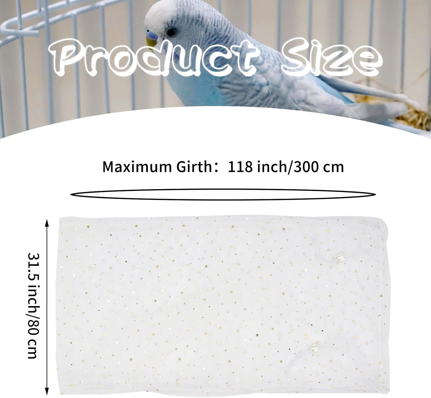 Daoeny Bird Cage Seed Catcher, Large Bird Cage Cover, Adjustable Soft Airy Nylon Mesh Net, Birdcage Cover Skirt Seed Guard for Parrot Parakeet Macaw African Round Square Cages (White, Sequins Star)