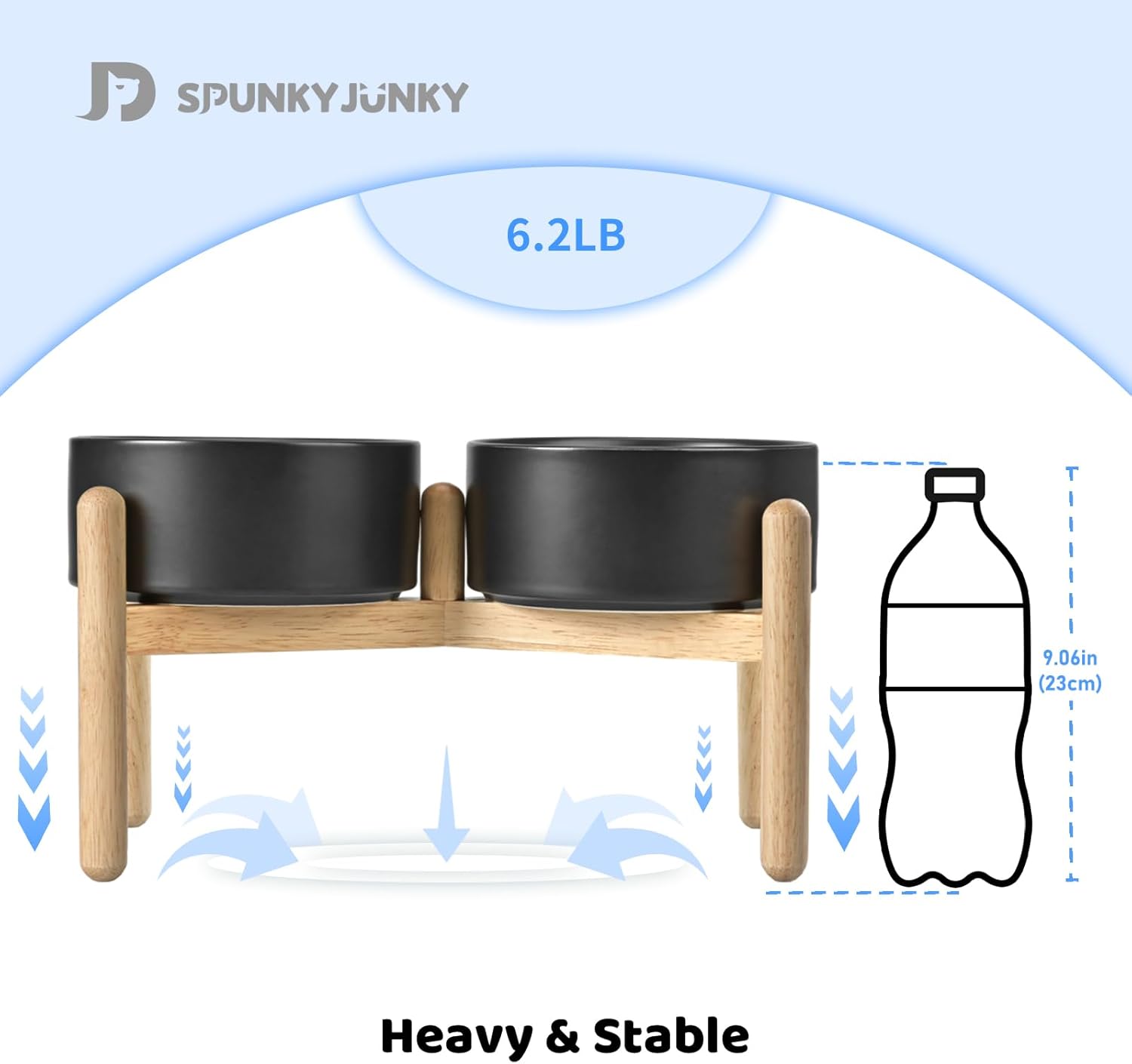 SPUNKYJUNKY Ceramics Elevated Dog Bowls with Wooden Stand Raised Dog Bowl for Medium Large Dog Food and Water Pet Feeding Bowl(Double 60OZ Bowls,Black)