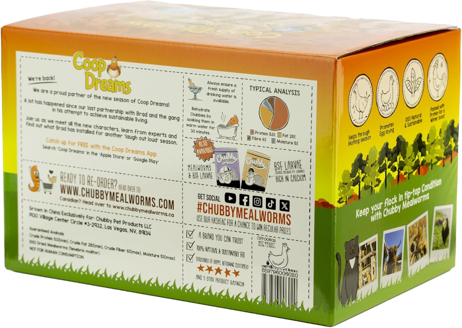 - PROTEIN PACKED ✔️ Chubby Dried Mealworms are packed with a whopping 53% protein and 28% essential fats that are vital to help a chicken's immune system during molting season and will help in rapid feather growth.