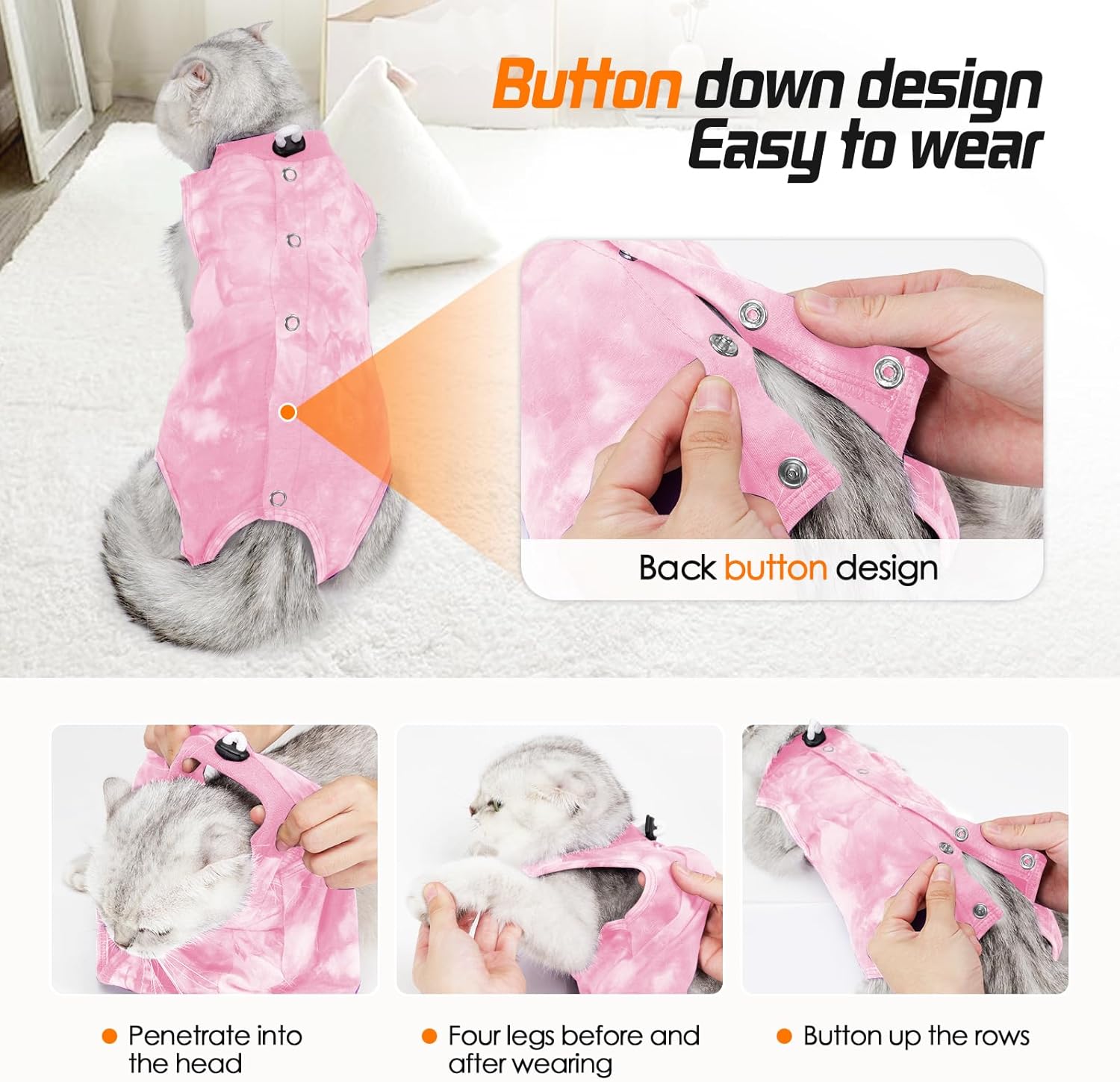 - [CONVENIENT VELCRO DESIGN]The back of our cat surgical suit is designed with a neck velcro and back buttons, you can quickly put on and take off for the cat, convenient and prevent secondary injury to the wound.