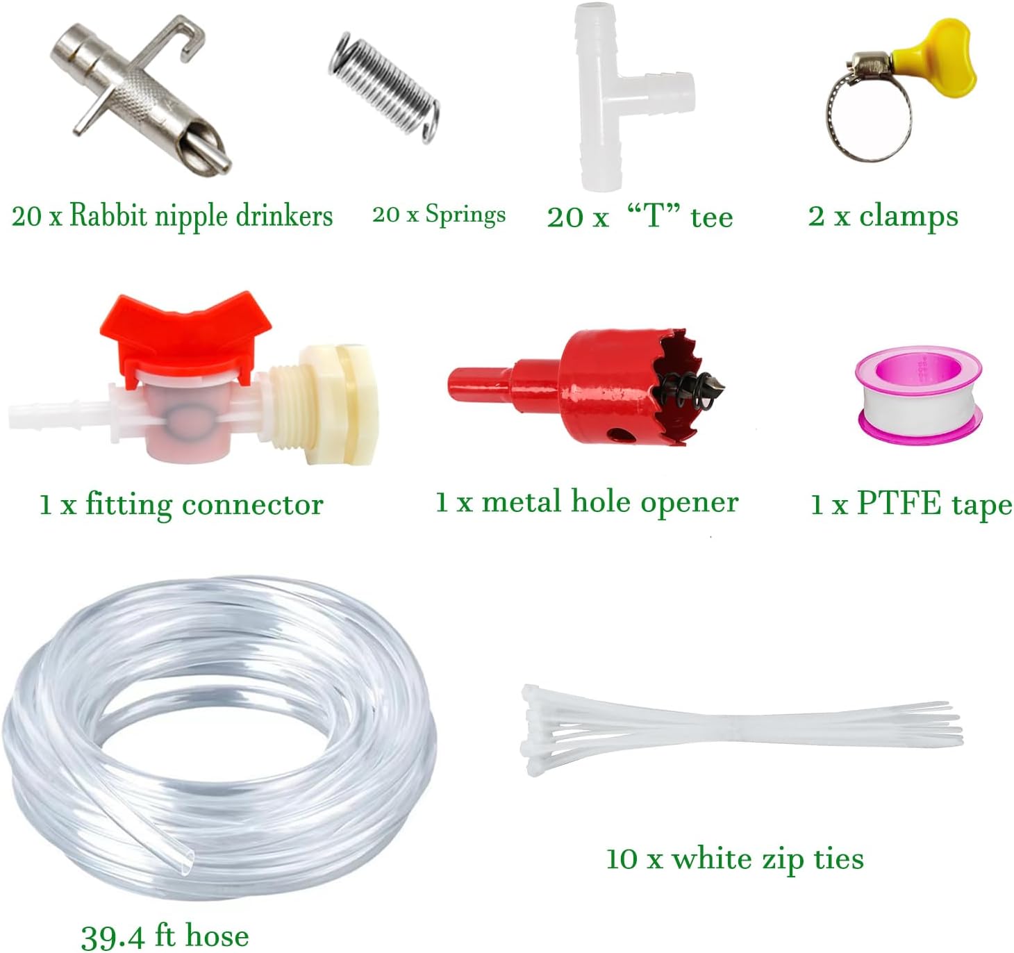 - PACKAGE INCLUDED: You will get 20 sets rabbit nipple drinkers(including a nipple drinker,a “T” tee and a spring) + 39.4 Ft hose + a barb fitting connector + a water tank connector + a hole opener tool + 10pcs zip ties + 2pcs clamps + 1pc PTFE tape.
