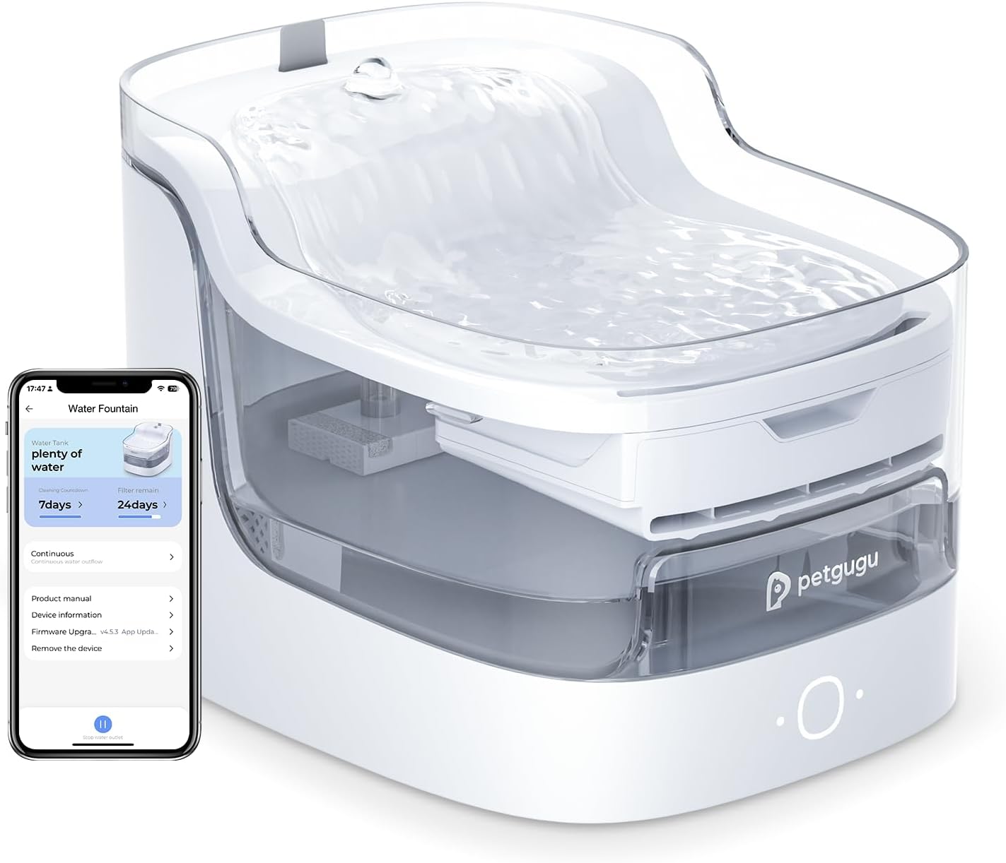 - Flowing Pure and Fresh Water: Experience the benefits of our advanced 8-layer filtration system. Combining activated carbon, ion exchange resin, mineral ceramic balls, and unique KDF material, our dog water fountain effectively removes impurities, softens water, and eliminates odors. The filter element can be used for about 30 days, depending on usage. Petgugu app conveniently alerts you when it's time for a replacement
