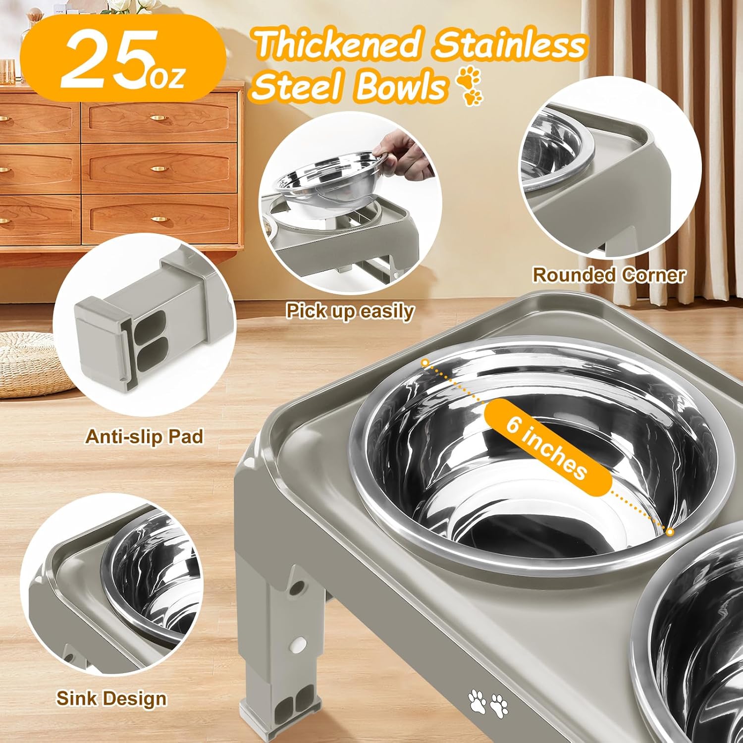 Elevated Bowls for Small Dogs - 3 Height Adjustable Raised Stand With 25oz Stainless Steel Food Bowls, Anti-Slip Feeder Adjusts to 7.5", 6", 2.75", Light Brownish Gray