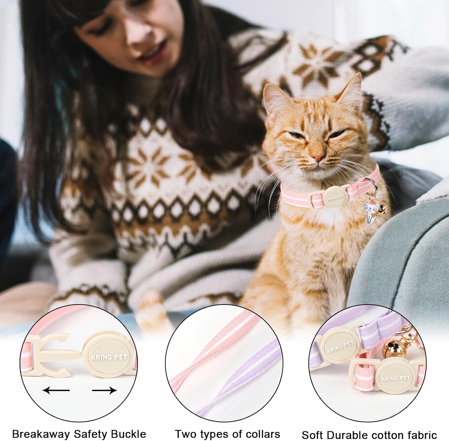 ARING PET 2 Pack Cat Collar-Cute Cotton Cat Collar with Bell & Pendant, Adjustable Pink Lavender Striped Kitten Collars with Safety Buckle for Girl and Boy Pets