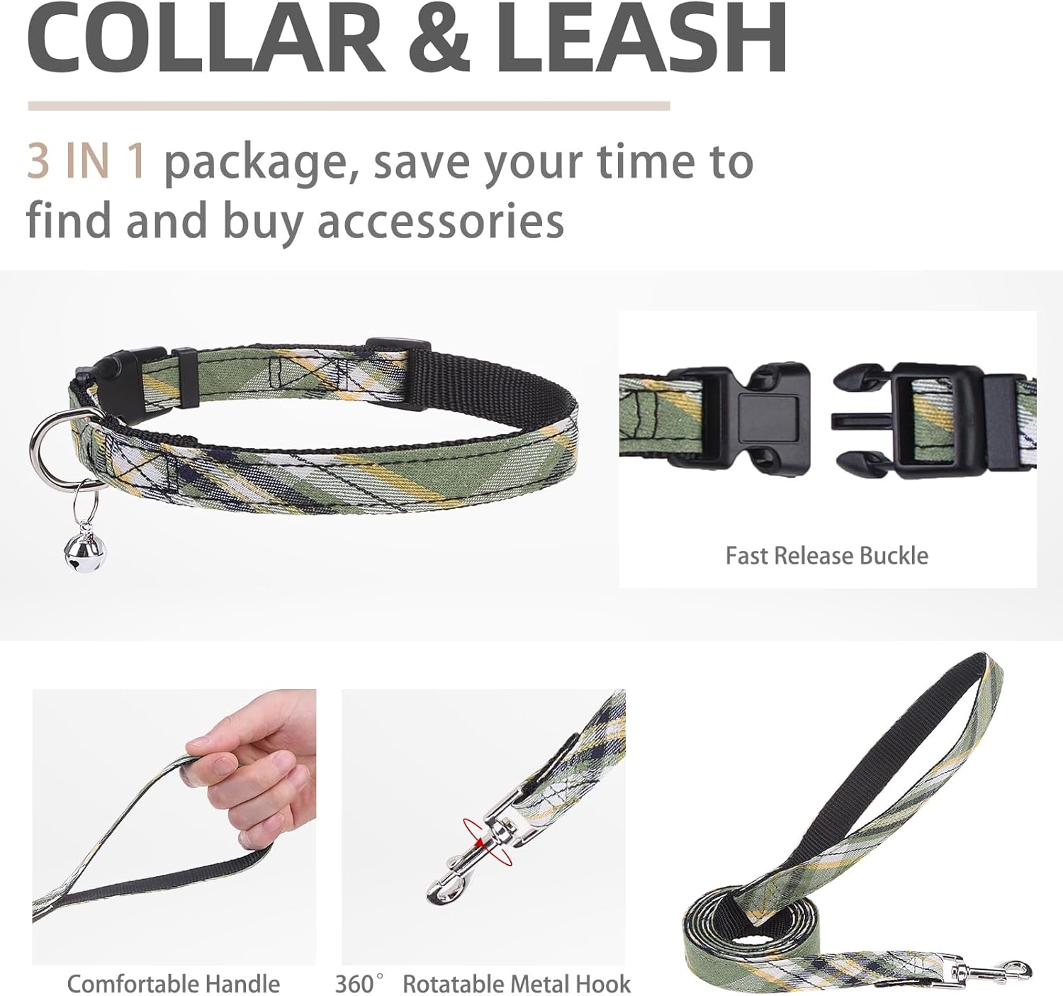 - [DOG HARNESS, COLLAR & LEASH] - The package includes three items, a walking harness, a collar, and a 4.9ft matching leash. The collar is with bell, the leash is equipped with a 360-degree rotation metal hook, and the harness is adopted with a quick-release buckle and double D-rings which are very heavy-duty. You don't need to spend extra time looking through other accessories, but you get all of these items at the same time with less money! So this is a very cost-effective set.