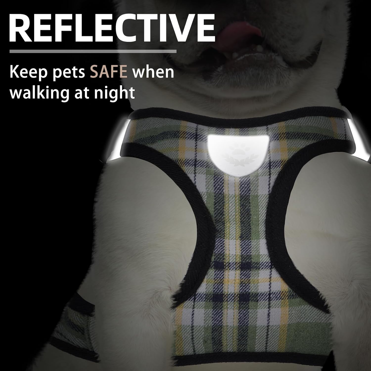 - [REFLECTIVE, PLAID PATTERN] - This Harness has two sides of reflective straps, and the middle logo also is reflective, so if you walk with your dog at night, then both of you will be safer! In addition, the classic plaid pattern is designed by our internal brand team, so it's very different from other normal harnesses. This plaid pattern looks both classic and stylish and is never out of date.