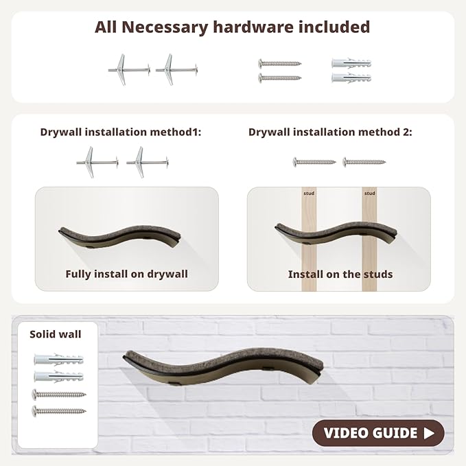 - Easy Installation - our wavy cat wall shelf includes installation instructions, screws, drywall anchors, and more. The hidden brackets are spaced 16 inches apart, providing flexibility to mount the shelf into wall studs or a solid wall. Installation is a breeze, and it only takes five minutes to create a floating cat shelf!