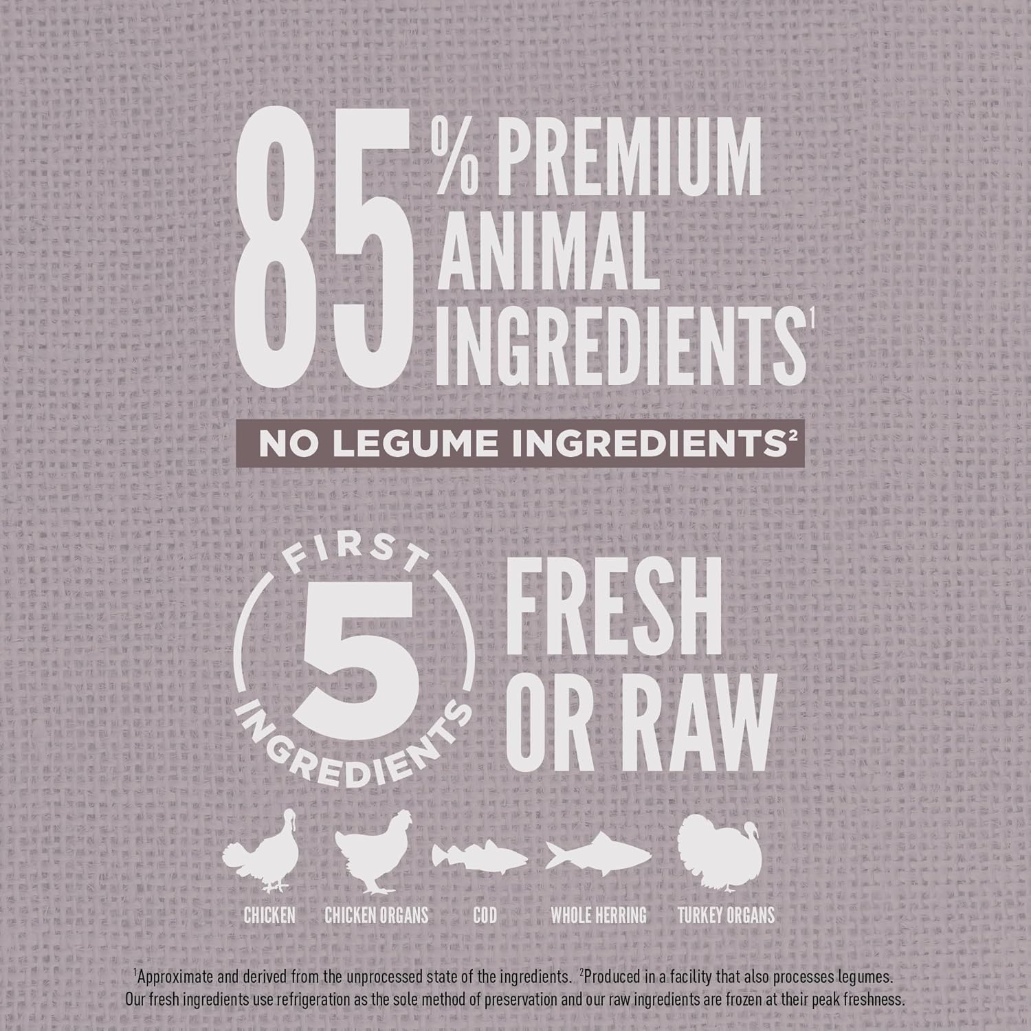 - ORIJEN AMAZING GRAINS authentic WholePrey diet features the most nourishing parts of the prey like poultry or fish, and organs to mimic what your dog’s ancestors consumed in the wild.