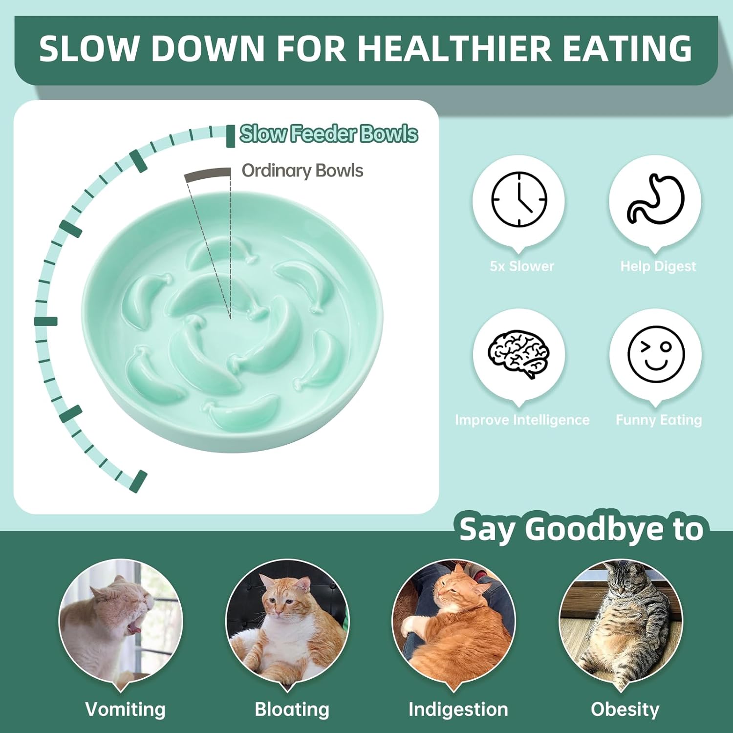Ceramic Cat Slow Feeder Bowl - Pastel Series Cat Plate for Dry and Wet Food - Cute Maze Feeder Dish for Healthy Eating - Dishwasher Safe - 6.3''W x 1.2''H - 7 OZ - Mint Green