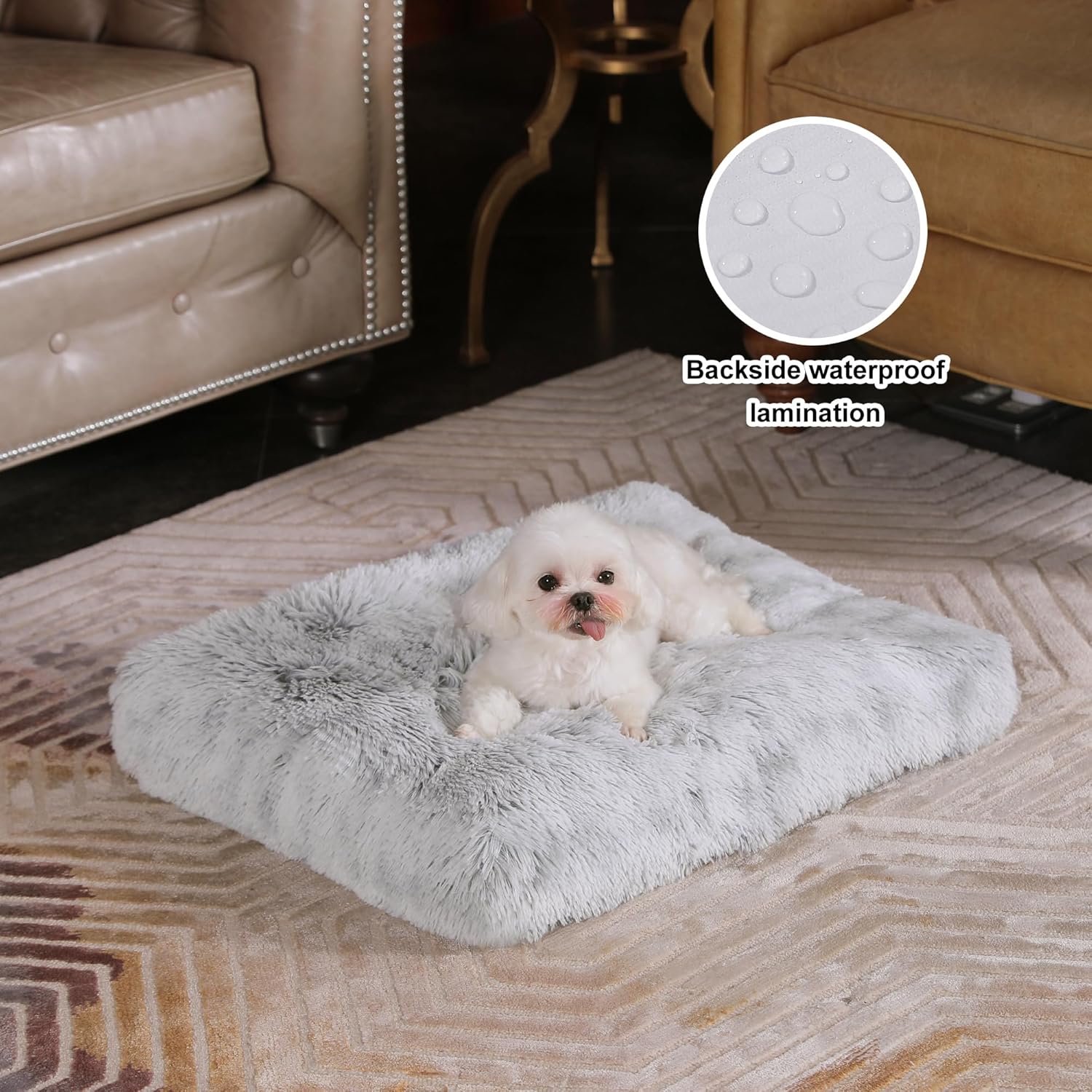 Bedfolks Waterproof Crate Bed, Plush Dog & Cat Bed with Removable Washable Cover, Faux Fur Kennel Pad, 17"x12", Grey