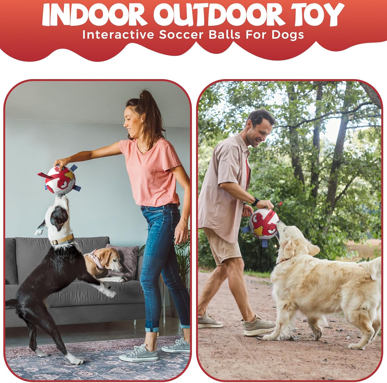 - ใ๐ถ๐ถUpgrade Interactive Dog ToyใDog soccer ball with nylon tabs sewn evenly into the seams not only create an erratic bounce that your dogs love to chase,but also make it easier for your dogs to fetch, toss, tug and retrieve.Dog paws are printed evenly on the dog toys ball to attract your dog attention.There's a longer strap for you to hold the ball,making it a great interactive dog toy to train your dogs.