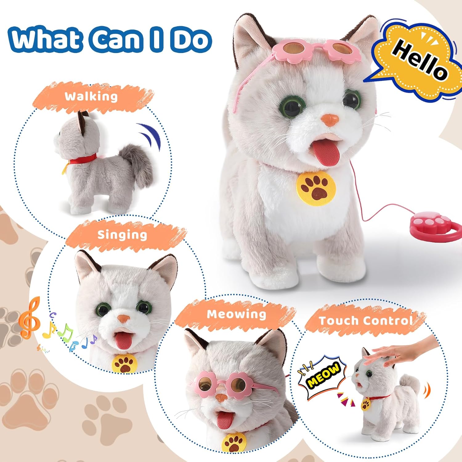 - Walking Singing Interactive Cat: Walking kid cat toy can sing 8 songs; it will make realistic meowing sounds, nodding head, wagging tail, sticking out its tongue, interact with kid positively. A wonderful kitten toy for girl, child, boy. Cute licky cat, meet meow meet lucky!