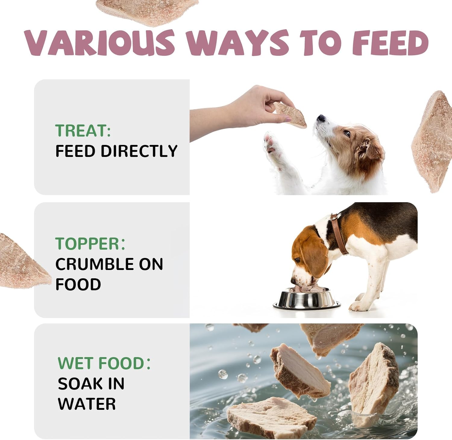 - Variety of Flavor: Whether given whole, crumbled for added flavor, or rehydrated to enhance the meaty aroma, PAWUP freeze dried treats offer a variety of feeding options. You can also choose different freeze dried treats from PAWUP to supply multiple flavor and comprehensive nutrition to your beloved furry pets