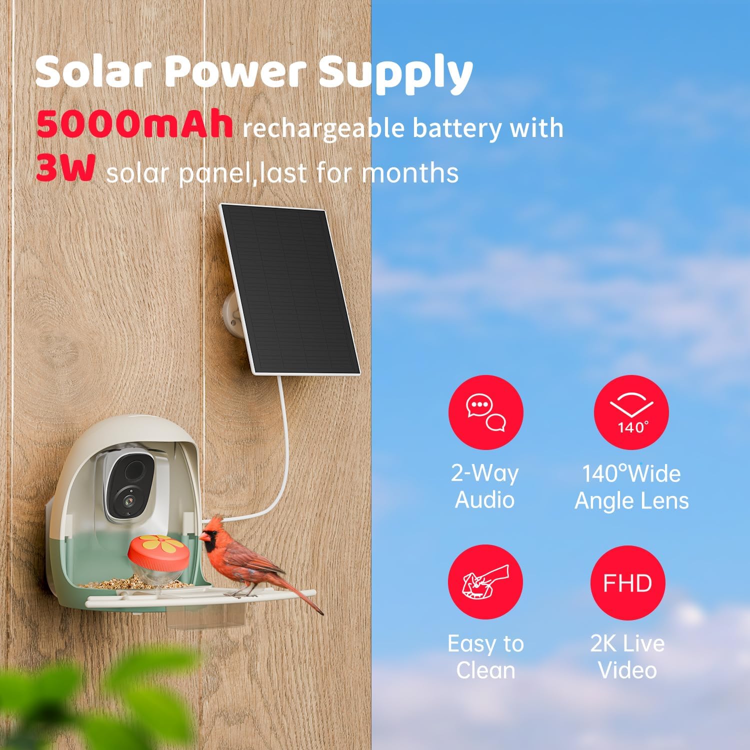 Bird Feeder with Camera Solar Powered, Smart Bird Feeder with AI Identify, 2K HD Live View and Instant Notification, Ideal Gift for Bird Lover(with 32G Card)